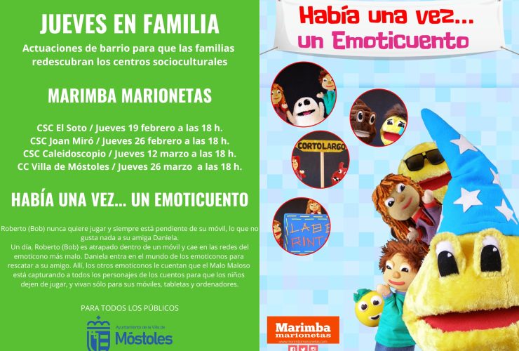 · El espectáculo “Había una vez… un emoticuento” se llevará a cabo el jueves 19 de febrero en el Centro Sociocultural El Soto; el 26 de febrero en el Centro Sociocultural Joan Miró; el jueves 12 de marzo en el ...