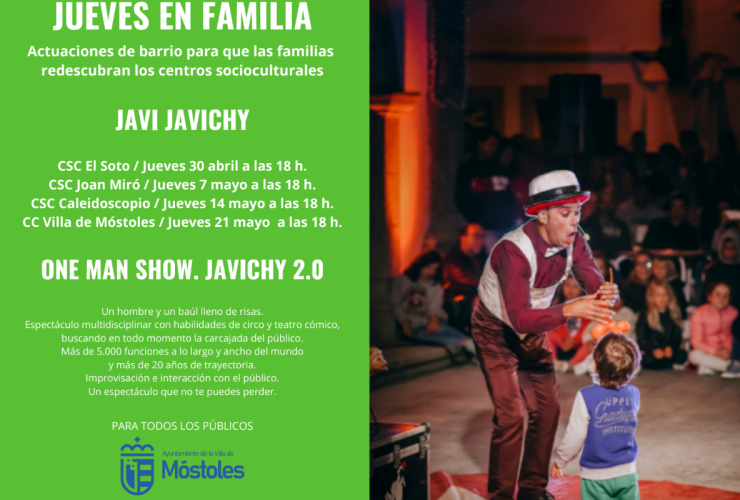 · Las familias mostoleñas podrán disfrutar del espectáculo “One man show. Javi Javichy 2.0” el jueves 30 de abril en el Centro Sociocultural El Soto, el 7 de mayo en el Centro Sociocultural Joan Miró, el 14 de mayo en ...