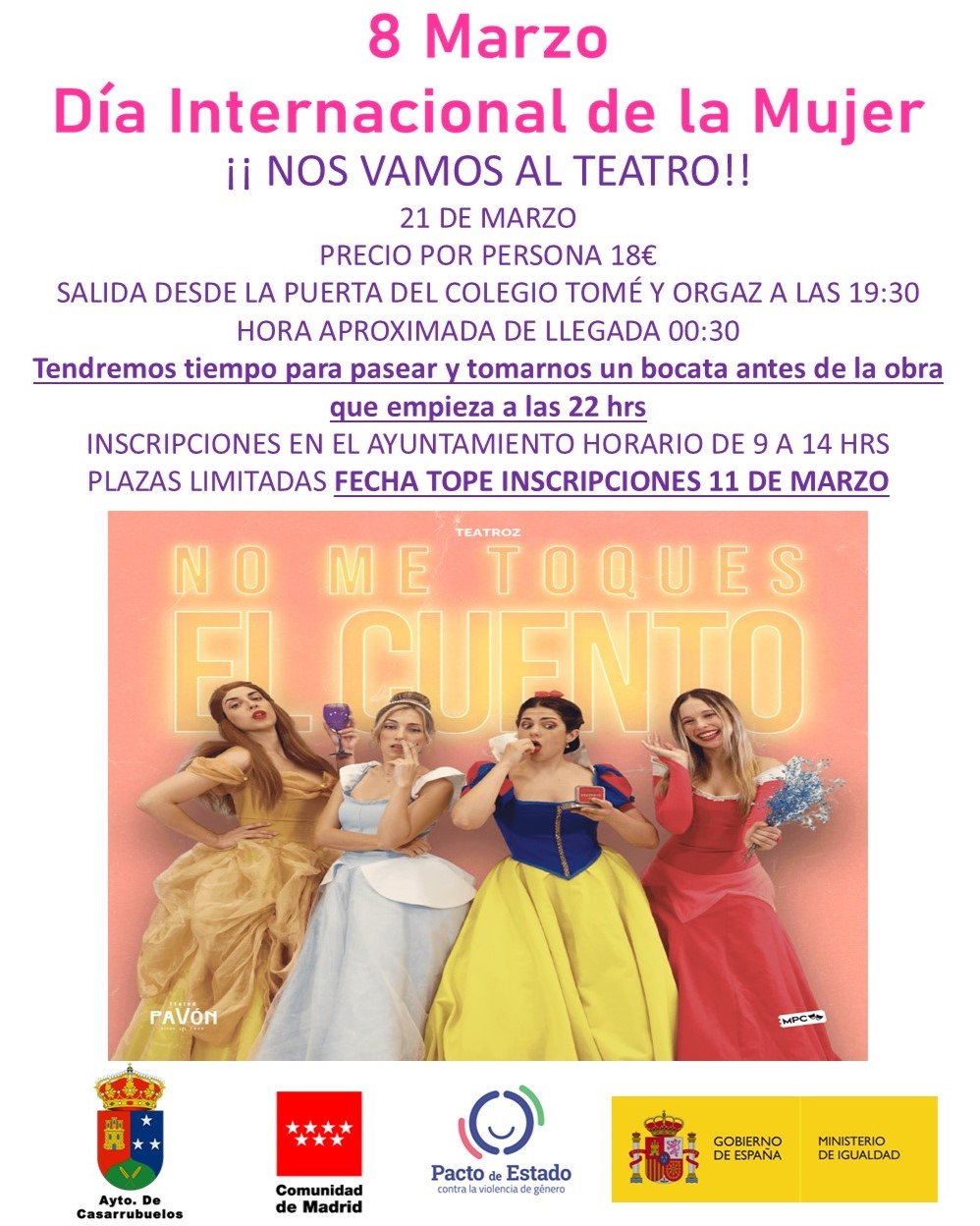 Con motivo del 8 de marzo, Día Internacional de la Mujer, el Ayuntamiento de Casarrubuelos organiza una serie de eventos para conmemorar esta fecha. Uno de los más destacados es la salida al teatro para disfrutar de la obra «No me toques el cuento» en el Teatro Pavón de Madrid.
