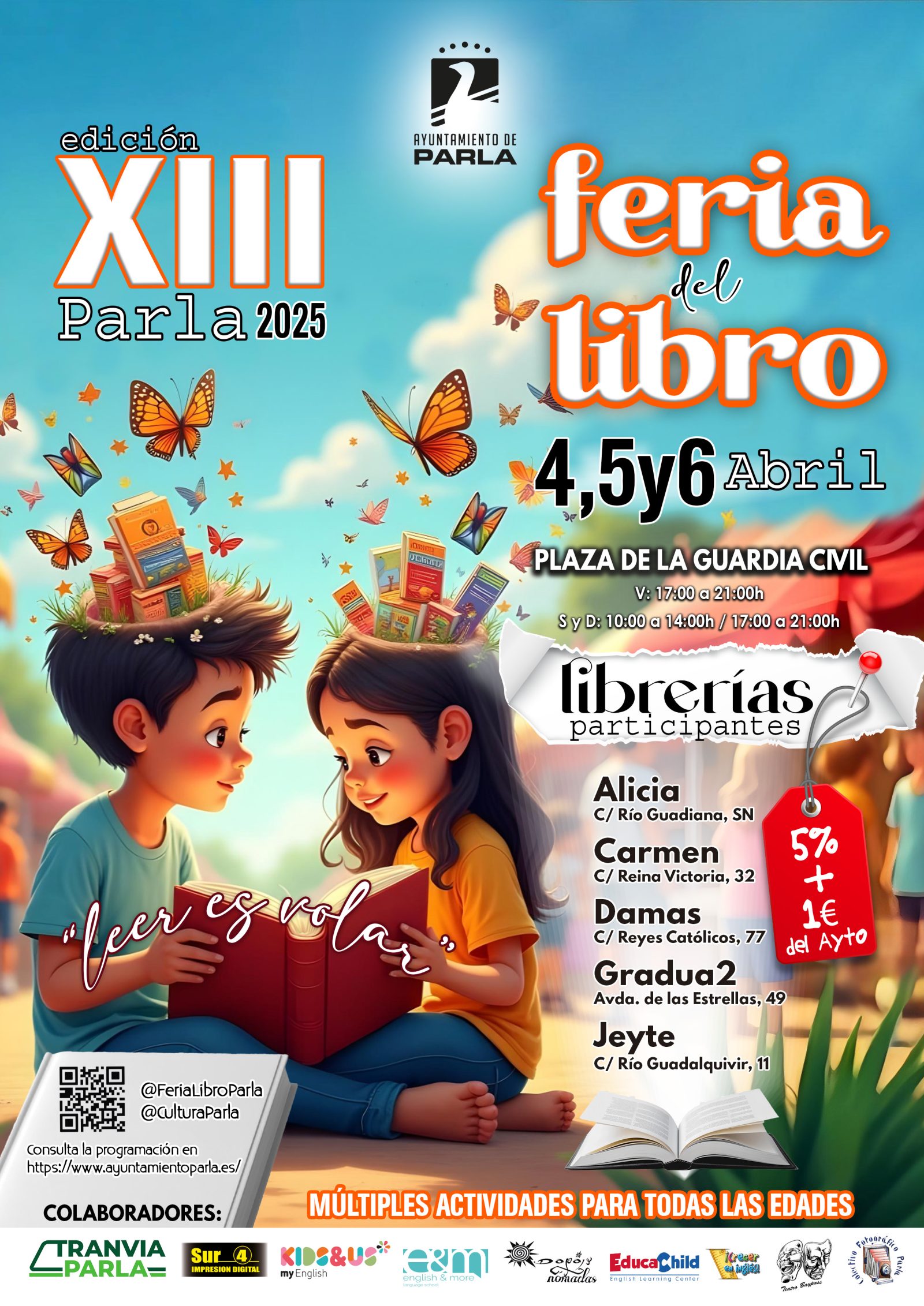 La XIII Feria del Libro de Parla concluyó con éxito tras tres días repletos de actividades culturales para todas las edades. Celebrada del 4 al 6 de abril en distintos espacios de la ciudad, la feria fue organizada por la Concejalía de Cultura del Ayuntamiento, en colaboración con el Centro de Iniciativas Empresariales (CIE), el Colectivo Fotográfico de Parla y Teatro Baypass. También participaron las Bibliotecas Municipales, cinco librerías locales y numerosos artistas del ámbito de la literatura, la ilustración y la narración.