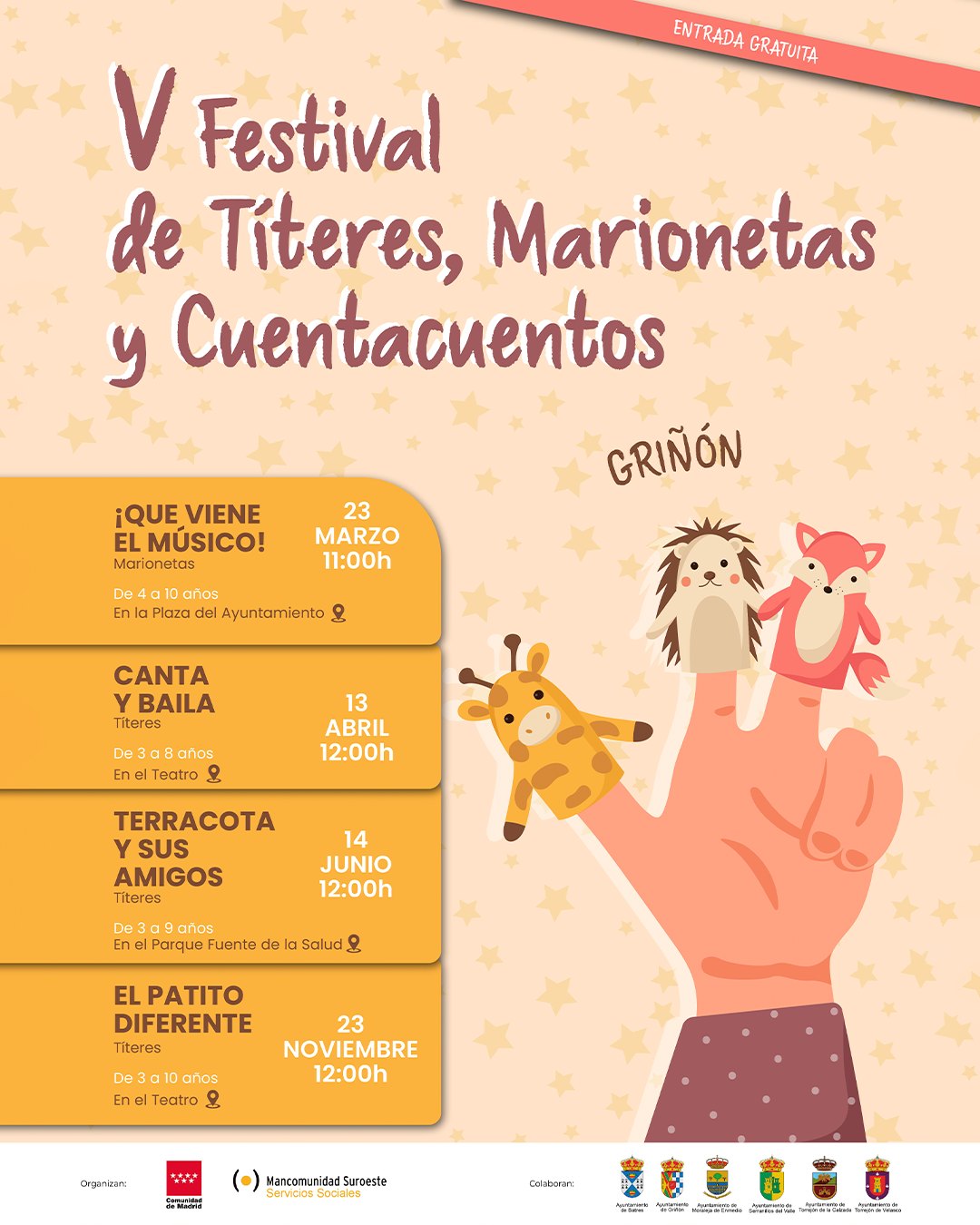 La Mancomunidad de Servicios del Suroeste de Madrid organiza el esperado V Festival de Títeres, Marionetas y Cuentacuentos, que se celebrará próximamente en la localidad de Griñón.