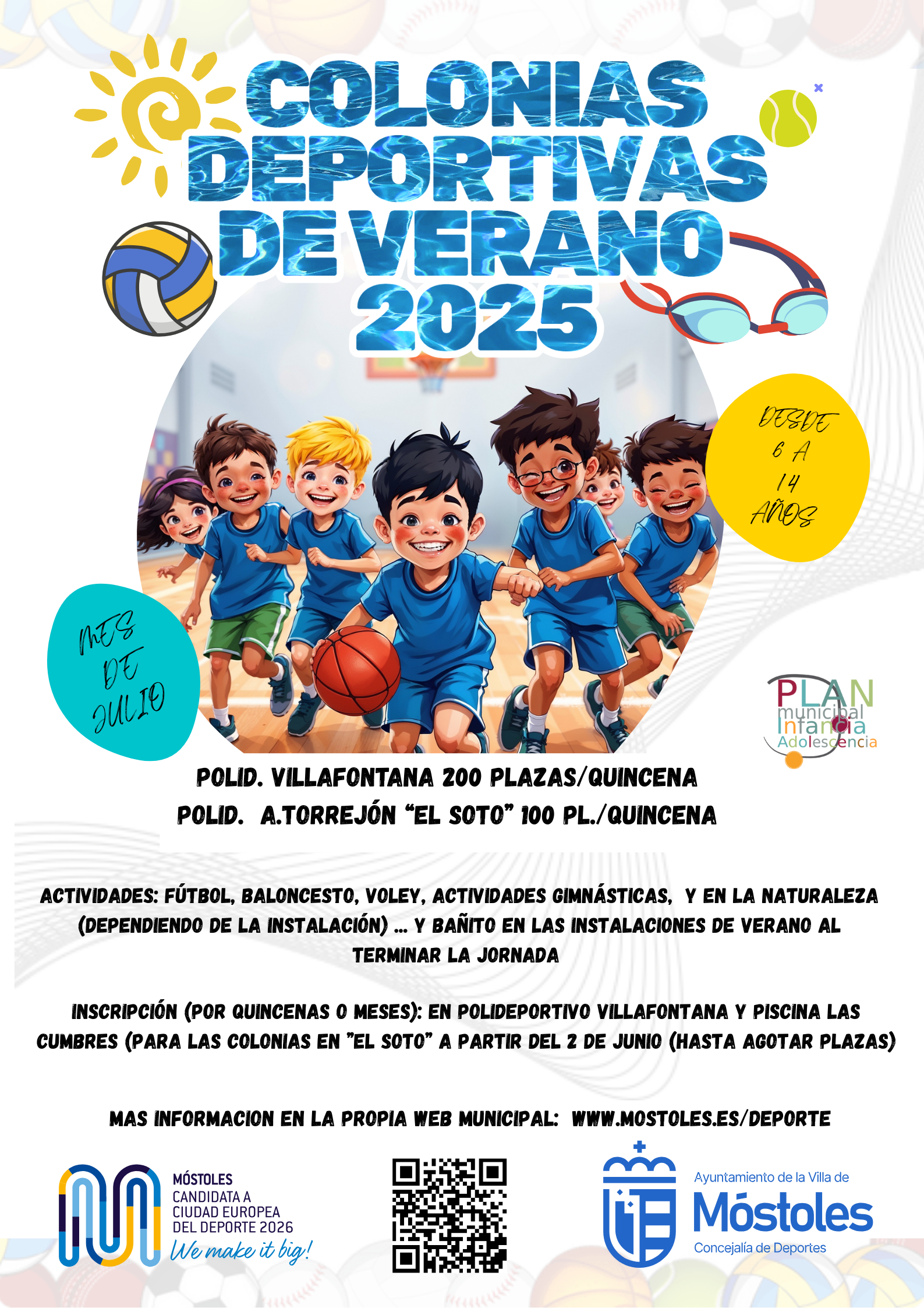 El Ayuntamiento de Móstoles, a través de la Concejalía de Deportes y Sanidad, ha anunciado la apertura de 600 plazas para las colonias deportivas de verano, una iniciativa destinada a niños y niñas de entre 6 y 14 años que se desarrollará durante el mes de julio. Las actividades tendrán lugar en los polideportivos Villafontana y Andrés Torrejón, y se podrán realizar por quincenas o durante el mes completo.
