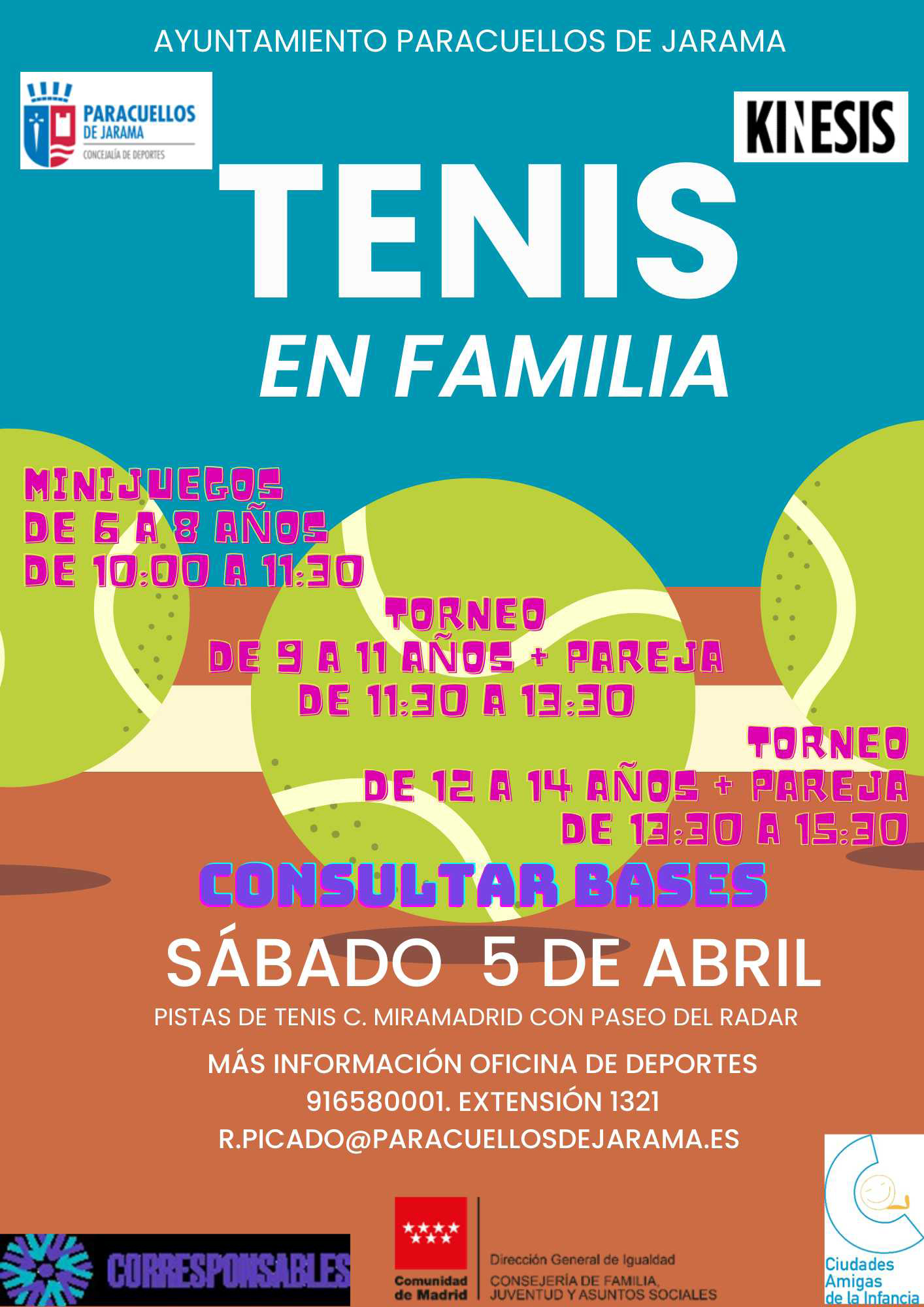 La Concejalía de Deportes del Ayuntamiento de Paracuellos de Jarama, en colaboración con la empresa Kinesis, ha organizado el ‘Torneo de tenis en familia’, que se celebrará el próximo sábado 5 de abril de 2025. El evento tendrá lugar en las pistas situadas en la confluencia del Paseo del Radar y la Calle Miramadrid, y promete ser una jornada festiva para disfrutar del deporte en familia.