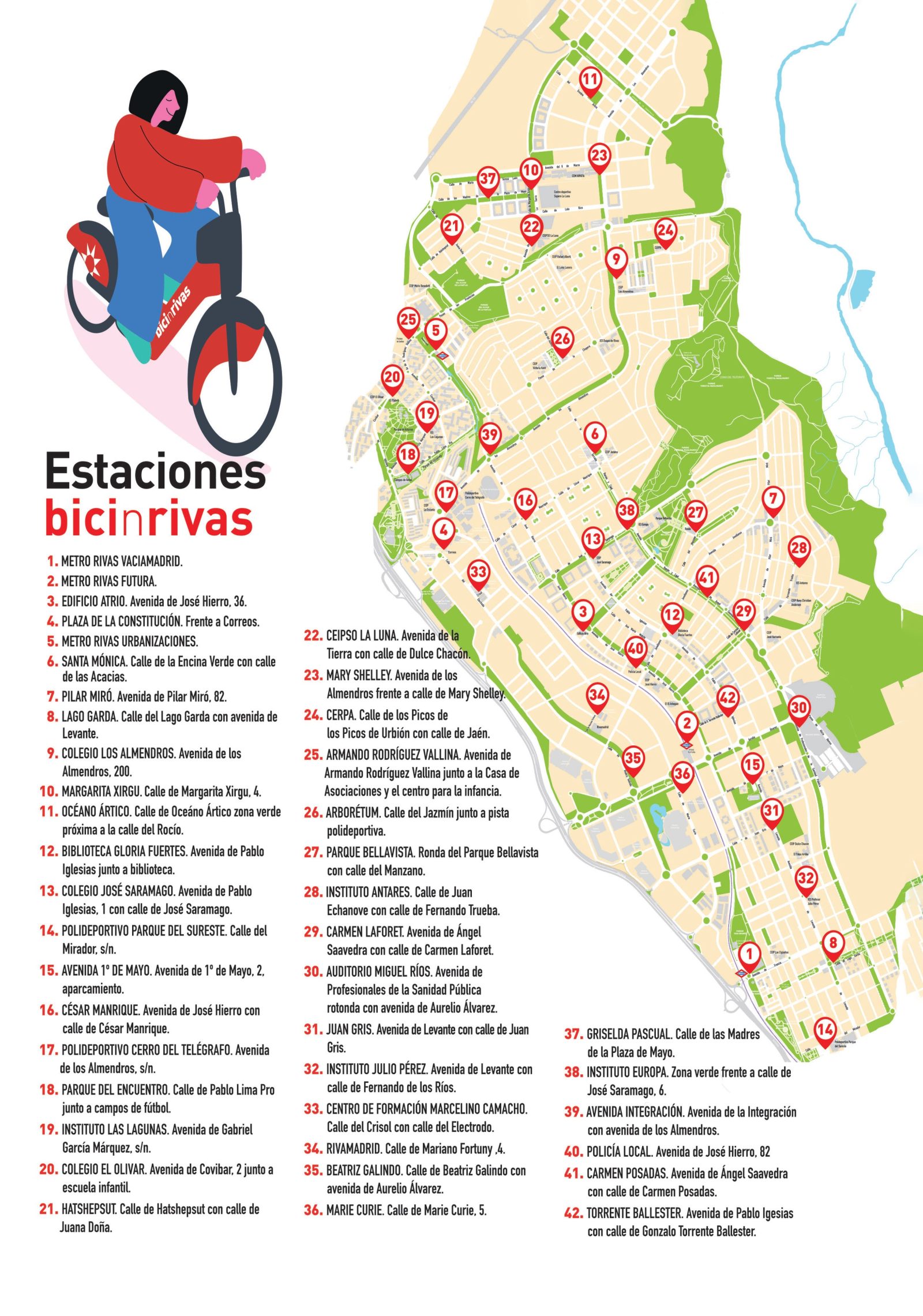 El nuevo BicinRivas contará con 42 estaciones de préstamo distribuidas por toda la ciudad, facilitando el acceso a las bicicletas a los vecinos y vecinas. En las últimas semanas se ha completado el montaje de 18 de estas estaciones, mientras que algunas han sido reubicadas en sus entornos actuales. En total, el número de anclajes se ha duplicado, alcanzando los 840, y el servicio dispondrá de 439 bicicletas eléctricas.