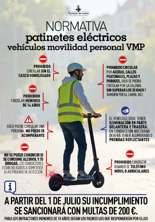 Ya está en vigor la nueva normativa de patinetes eléctricos VMP que recoge las obligaciones que deben cumplir los usuarios y que prevé multas de 200 euros para los infractores. Durante los meses de mayo y junio de 2025, la Policía Local de Torrejón de Ardoz ha apercibido a los conductores que no cumplían estas normas y ya se sancionará con multas de 200 euros a los infractores. En el caso de los menores de 18 años, será los padres los que responderán por ellos. El primer objetivo de esta ordenanza es proteger la integridad de los usuarios de los patinetes, así como de los peatones.