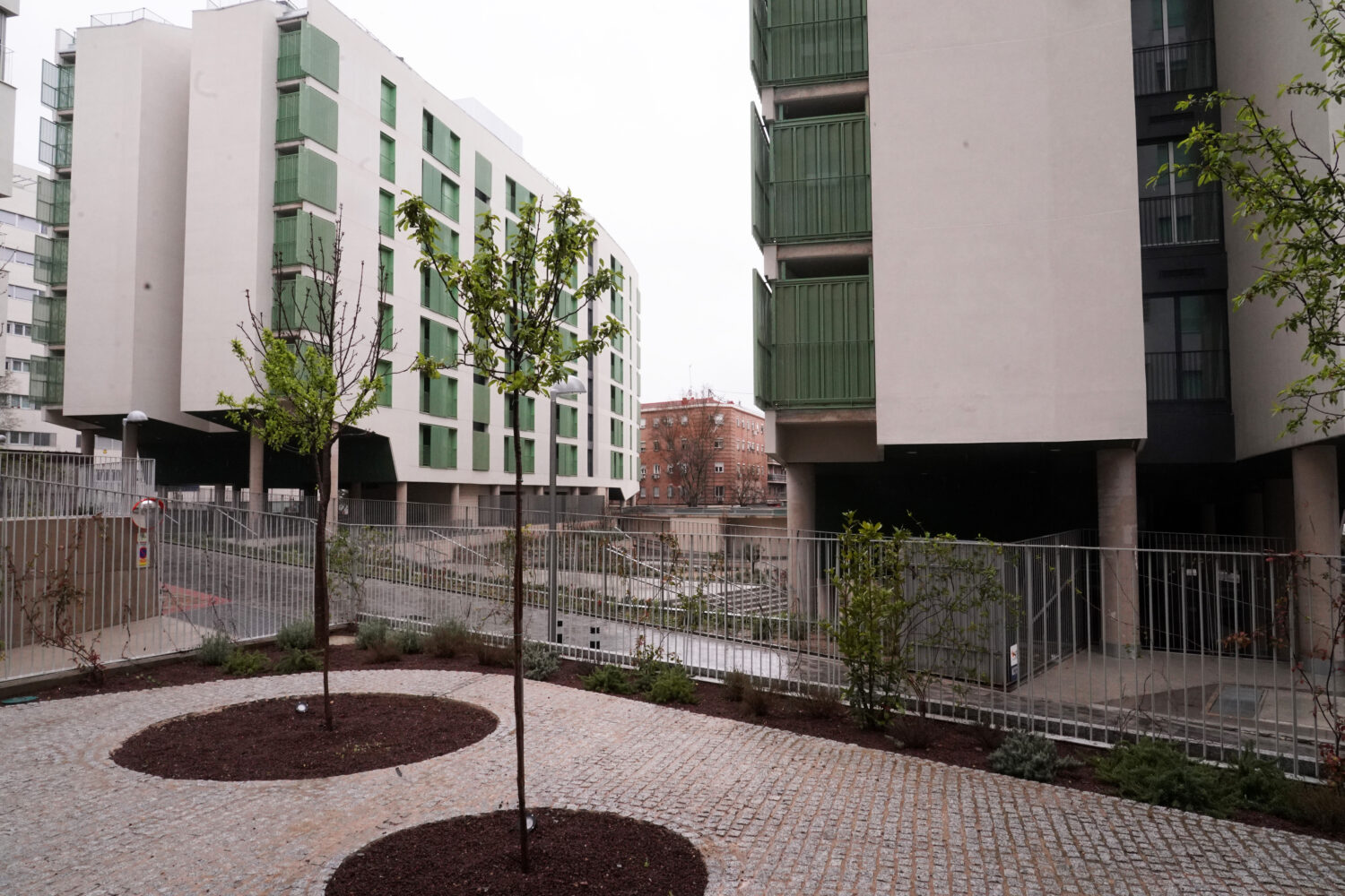 La promoción, con una inversión de 14,2 millones de euros, forma parte del ecobarrio de Puente de Vallecas, un modelo de urbanismo sostenible con 12 desarrollos de EMVS Madrid que suman 1.200 viviendas. Este barrio incorpora soluciones medioambientales innovadoras, como calefacción eficiente y recogida de residuos automatizada, reduciendo las emisiones de CO2 en un 43 % y disminuyendo los costes de mantenimiento.