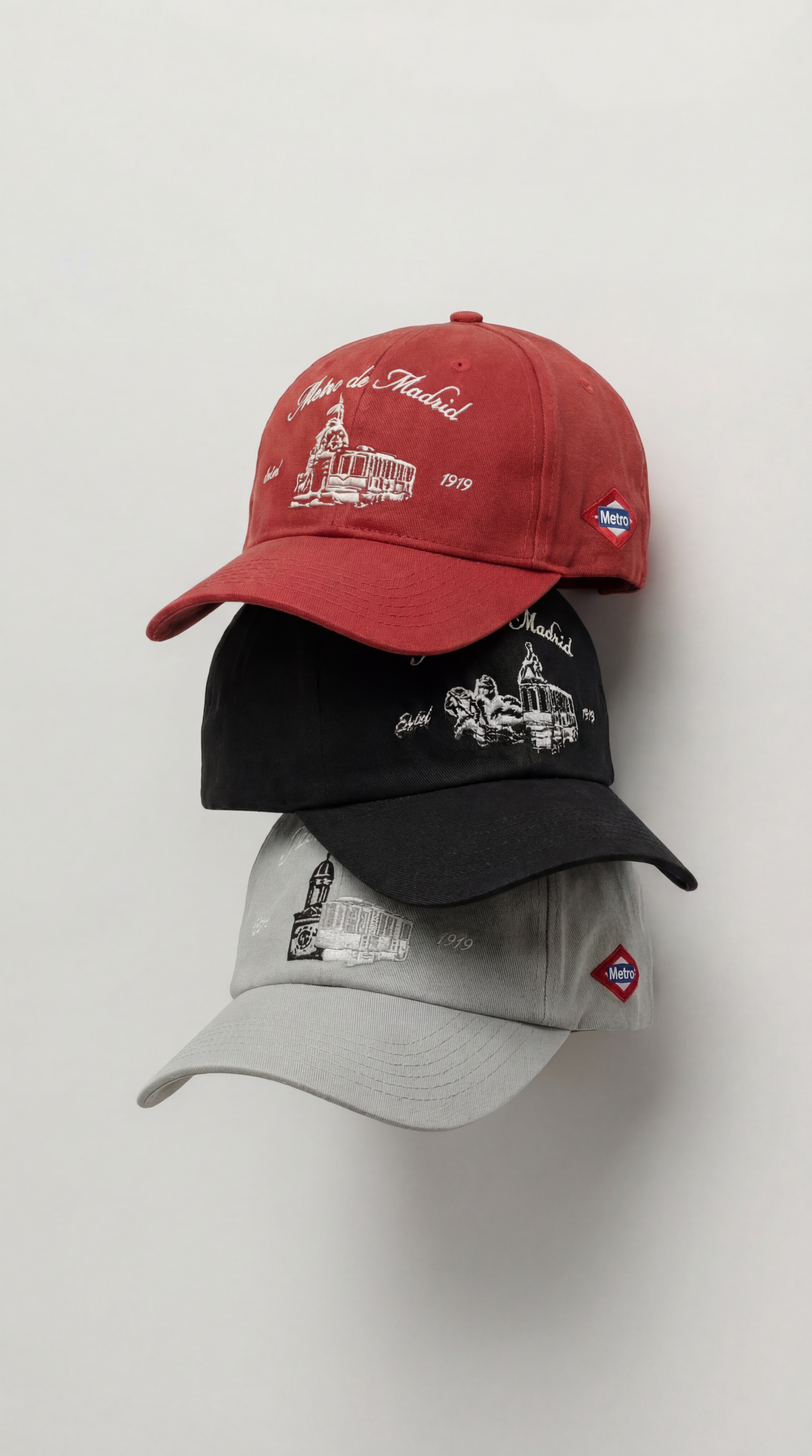 Cada gorra tiene un precio de 24,95 euros y está confeccionada en algodón, con distintos colores y diseños. Todas comparten dos elementos comunes: el emblemático rombo de Metro bordado en el lateral y una ilustración frontal en la que aparece un tren junto a iconos de Madrid.