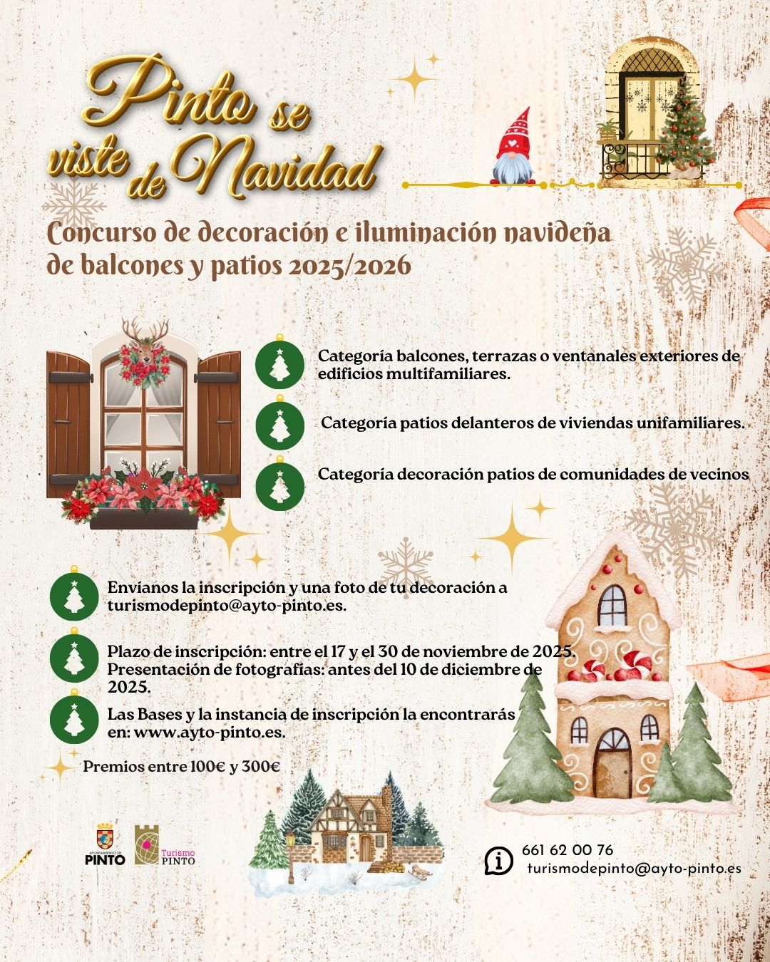 Vivir la Navidad también en patios y fachadas tiene premio en nuestra ciudad. El Ayuntamiento de Pinto, a través de la Concejalía de Emprendimiento y Turismo que dirige Víctor Alonso, lanza una nueva convocatoria para participar en el concurso de decoración navideña de patios y balcones.