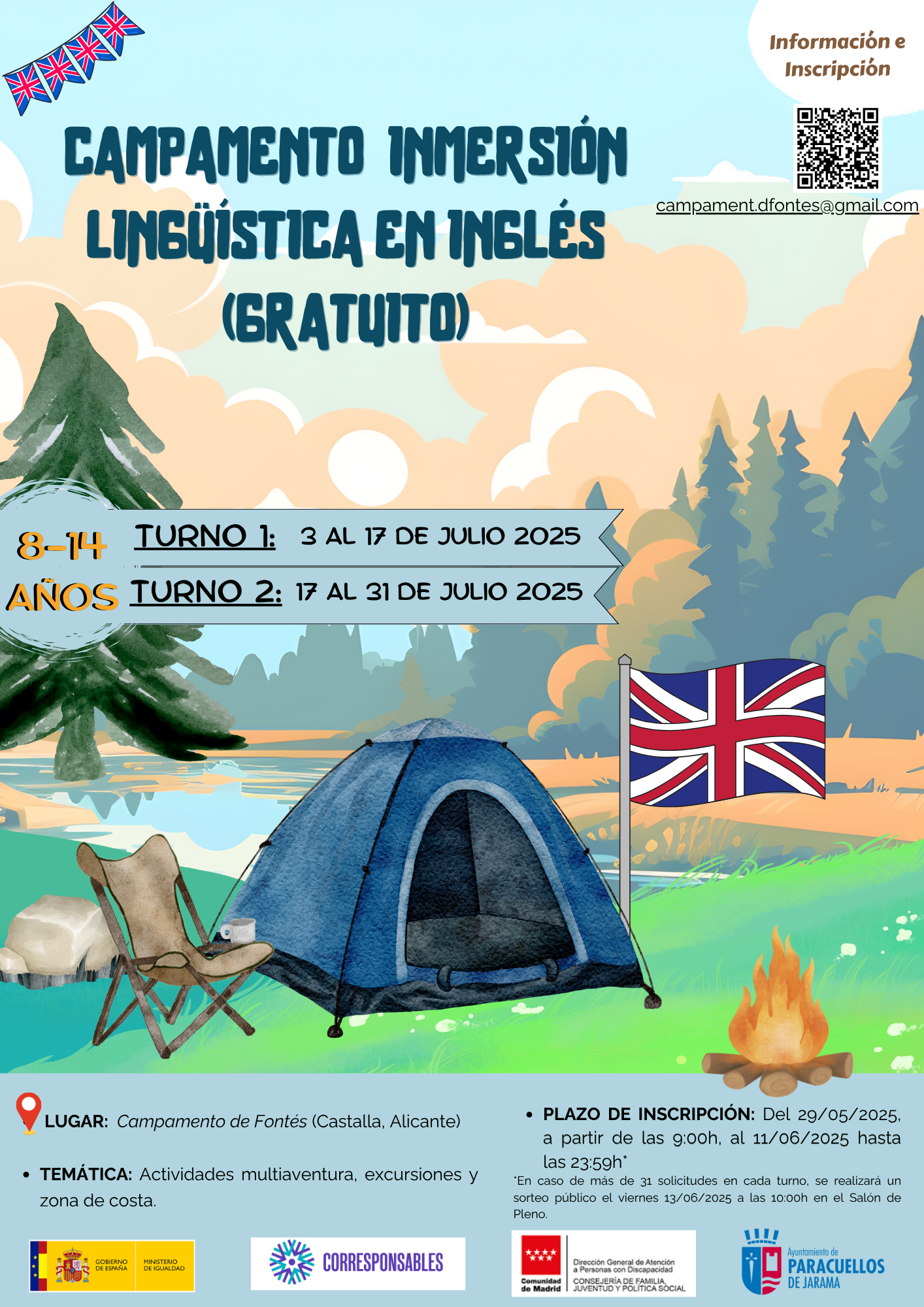 El Ayuntamiento de Paracuellos de Jarama ha anunciado la puesta en marcha de un campamento gratuito de inmersión lingüística en inglés dirigido a niños y jóvenes empadronados en el municipio con edades comprendidas entre los 8 y 14 años. La actividad se llevará a cabo en dos turnos durante el mes de julio en el Campamento Fontés, situado en la localidad alicantina de Castalla.