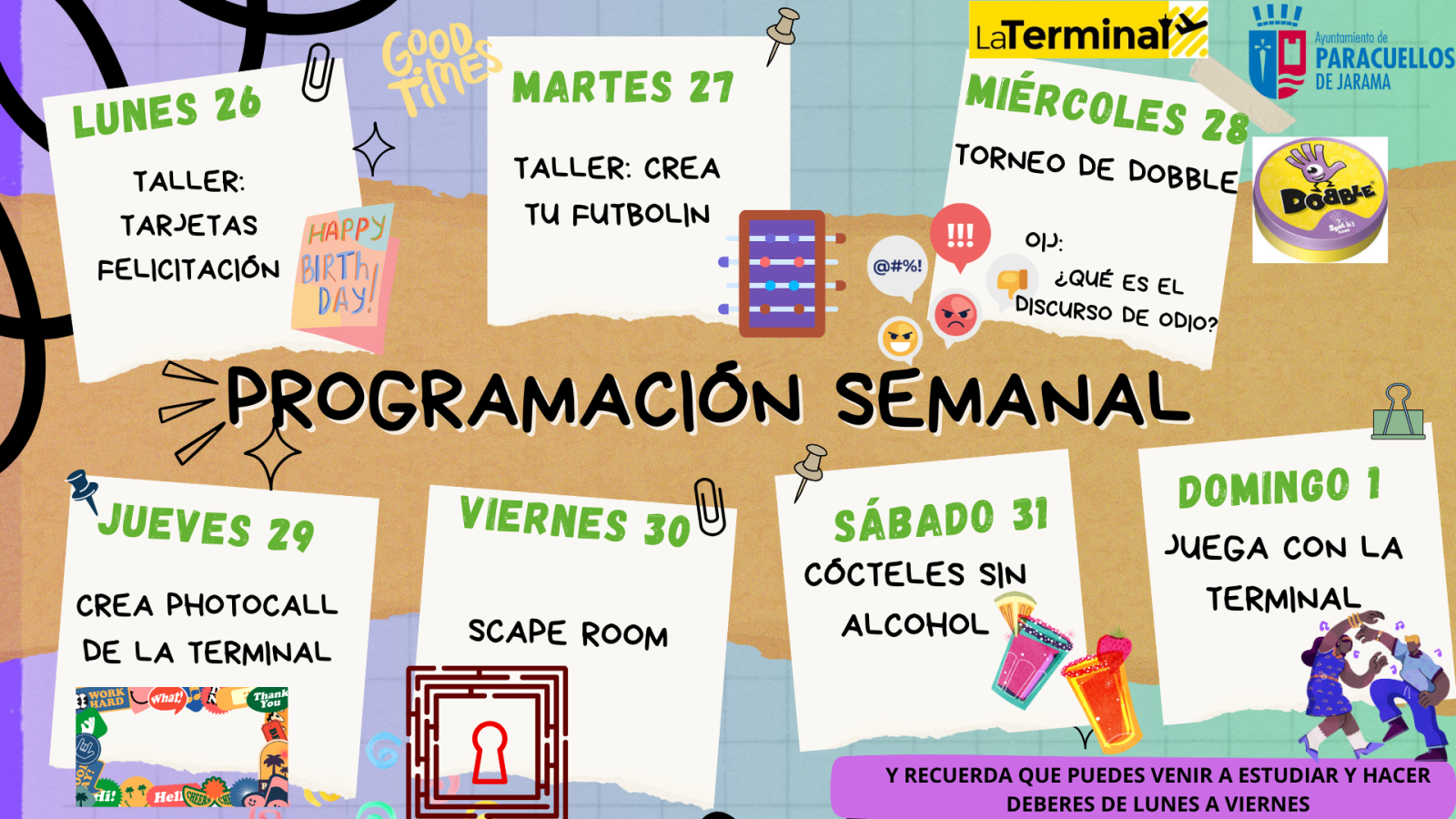 El Ayuntamiento de Paracuellos de Jarama ha presentado la nueva programación de actividades del Centro Joven La Terminal, dirigida a jóvenes mayores de 12 años. Las actividades se desarrollarán del 26 de mayo al 1 de junio de 2025 y están diseñadas para fomentar la creatividad, la diversión y el aprendizaje en un espacio dedicado a la juventud.