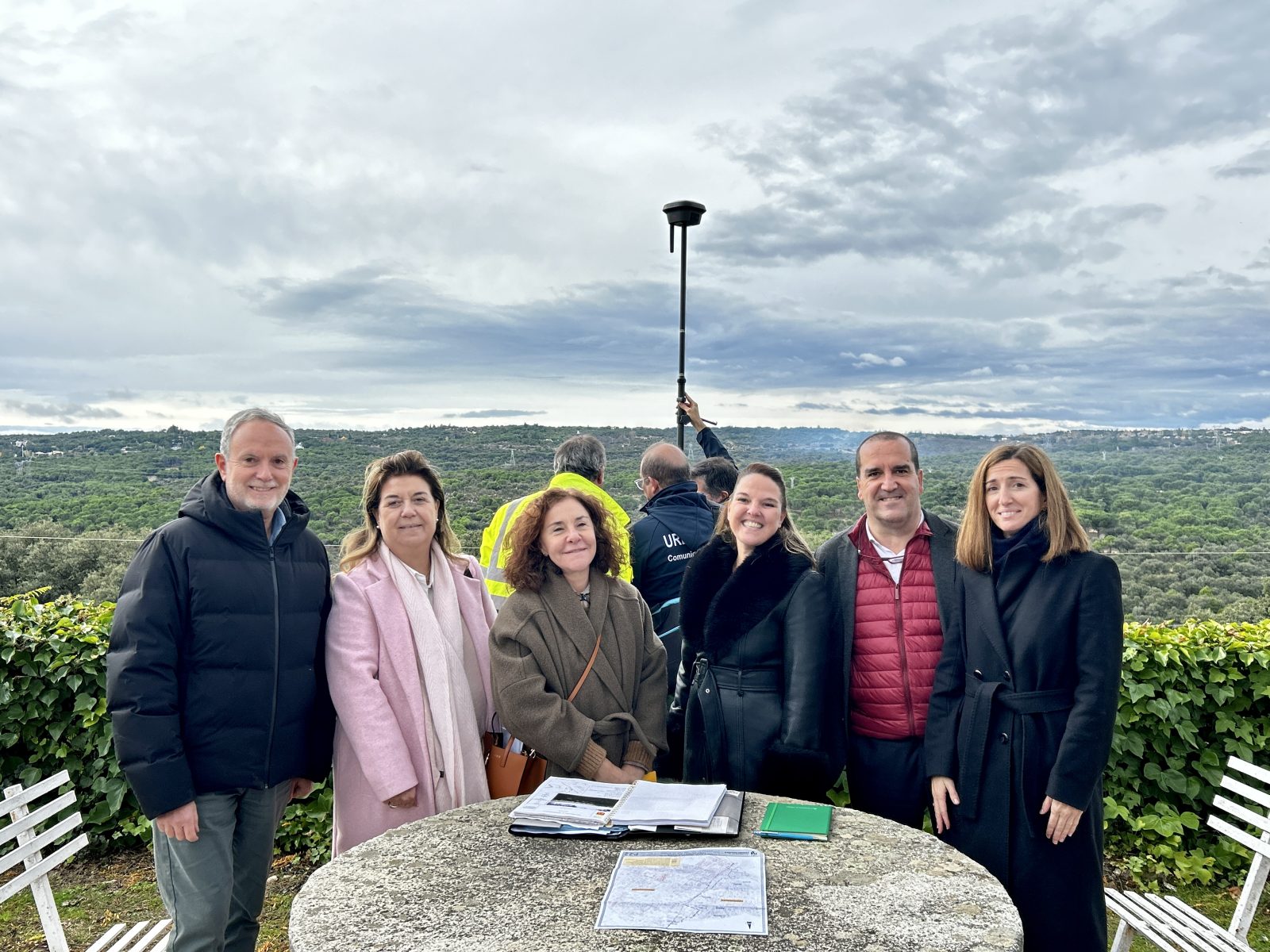Pastor , la alcaldesa de Galapagar, Carla Gr eciano, y los ediles galapagueños de Régimen Interior, Transportes y Empleo, Miguel Ángel Domínguez, y de Medio ambiente y Cultura, Paloma Lorenzo Murillo, que han posado junto al mojón auxiliar número 13, el primer punto de este tramo de frontera redefinido entre Torrelodones y Galapagar.