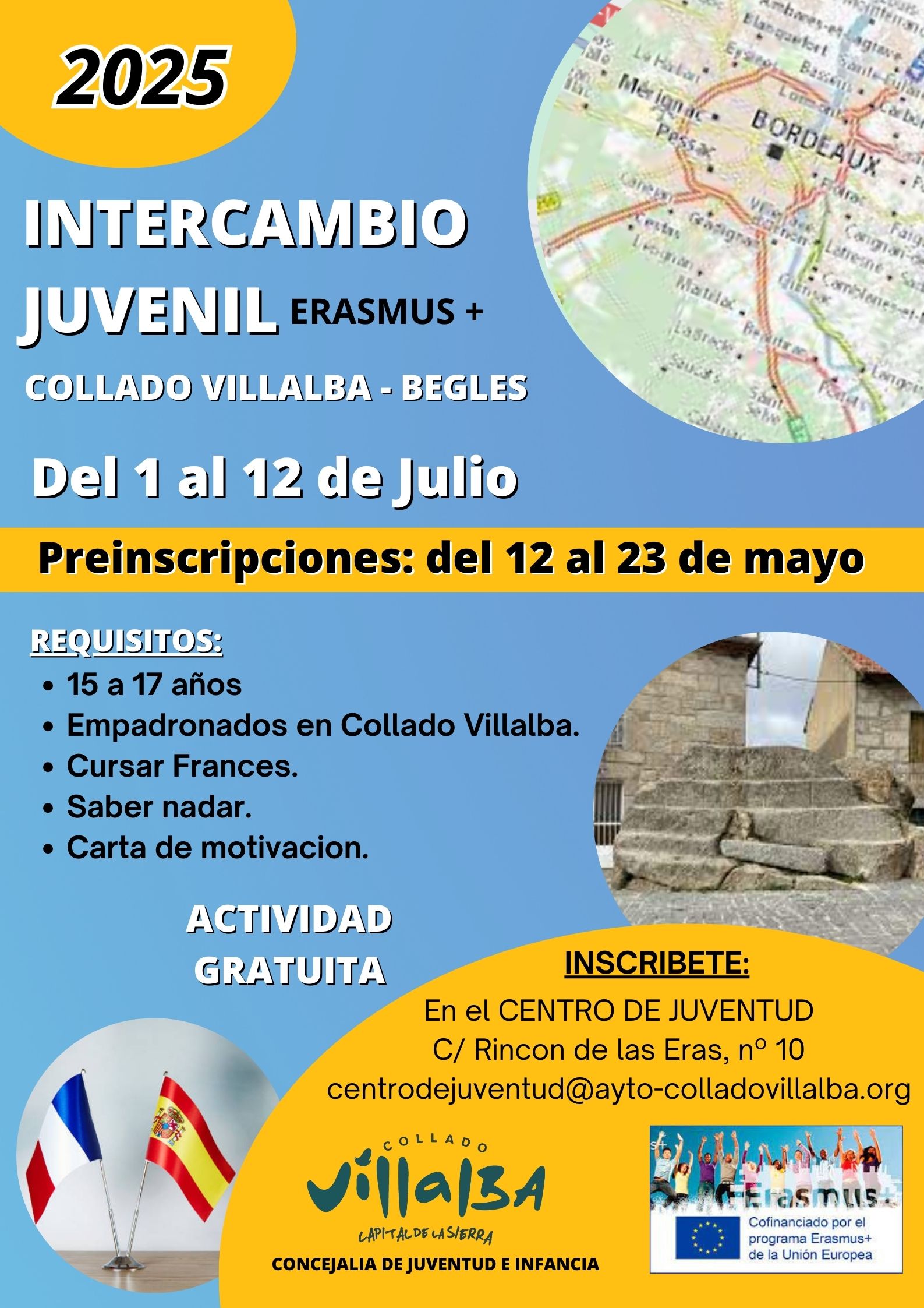 Un verano más, la Concejalía de Infancia y Juventud de Collado Villalba organiza el tradicional intercambio juvenil con las localidades francesas de Bègles y Soulac. Este programa, que se desarrollará durante el mes de julio, está enmarcado dentro del programa europeo Erasmus+.