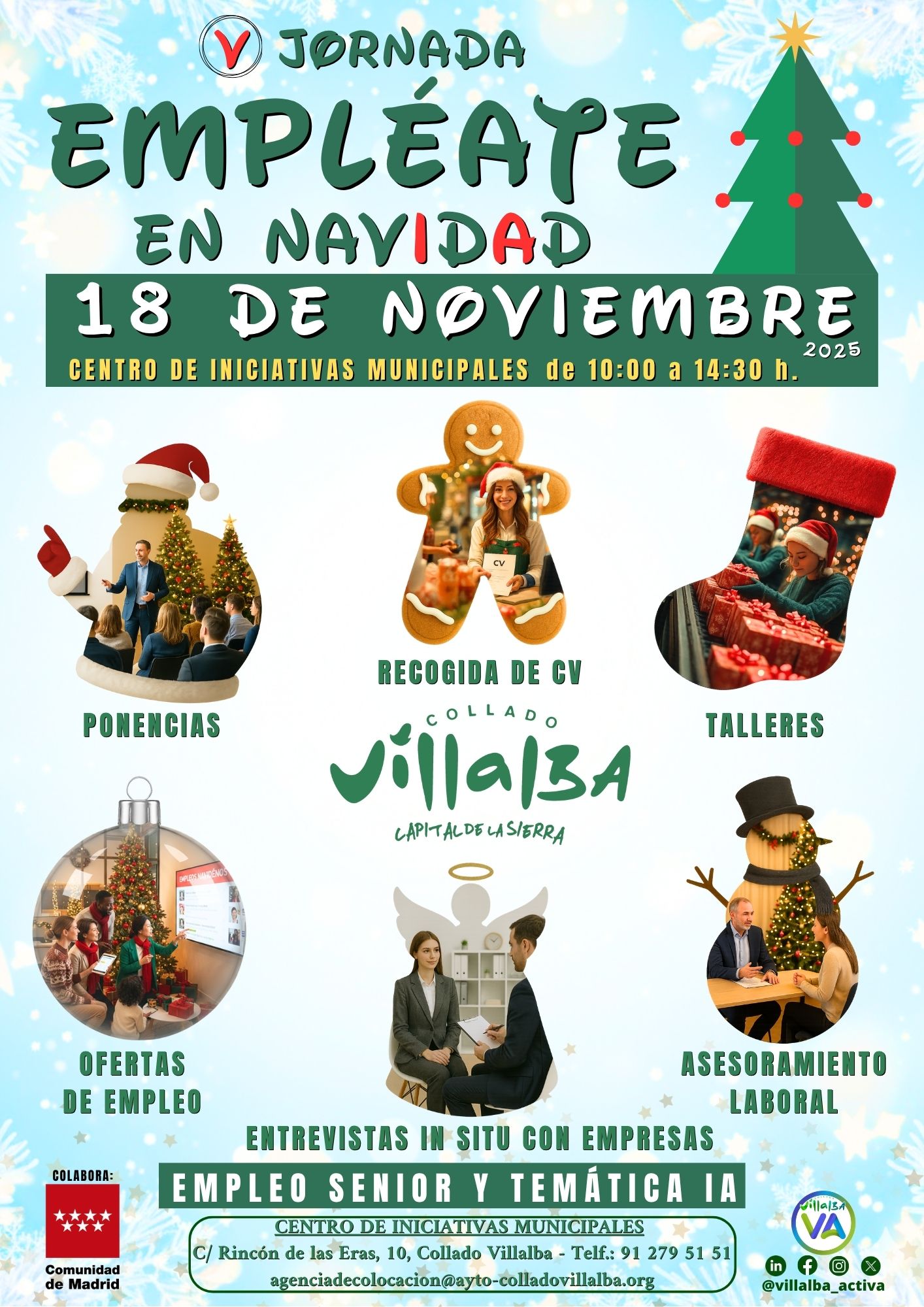13-11-2025.– El Ayuntamiento de Collado Villalba, a través de la Concejalía de Empleo, Formación y Empresas, organiza el próximo martes 18 de noviembre la V edición de la Jornada de Empleo ‘Empléate en Navidad’, que se celebrará en el Centro de Iniciativas Municipales.