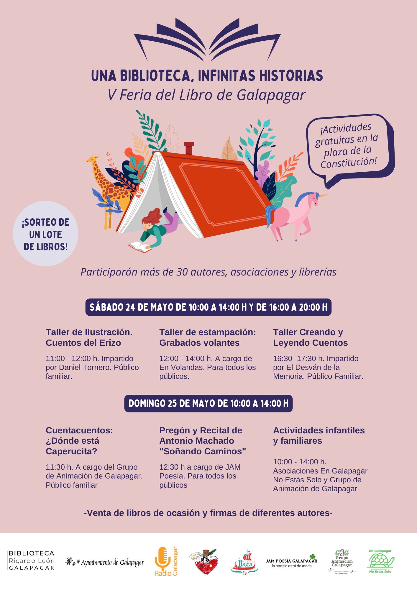 El domingo 25 de mayo, la feria continuará de 10:00 a 14:00 horas, con un enfoque especial en los libros de segunda mano y ocasión, de la mano de las asociaciones En Galapagar No Estás Solo e Ítaca. También se contará con la presencia de ocho autores firmando ejemplares y una variada oferta de actividades culturales y familiares.
