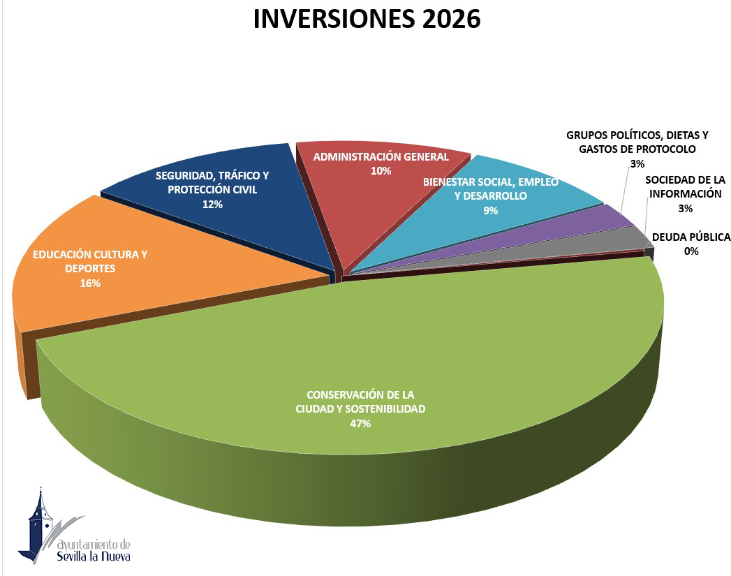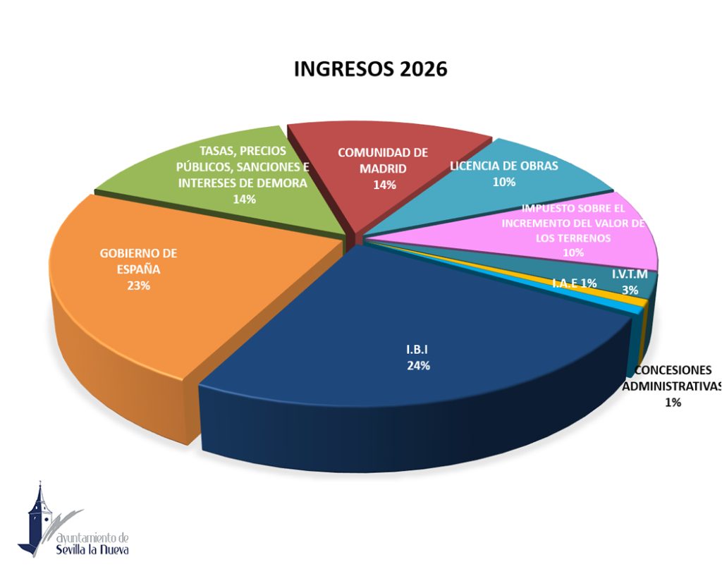 Pero si hay un aspecto que define al Presupuesto 2026 es la firme apuesta por la inversión pública. El Capítulo 6, con 3.115.014,76 euros, destina una quinta parte del presupuesto total a proyectos que impulsan la transformación del municipio: la construcción del nuevo edificio cultural polivalente, la renovación de la Plaza de España, un nuevo Punto Limpio, la ampliación de vivienda pública para jóvenes y familias, mejoras de accesibilidad en varias urbanizaciones, actualización del alumbrado en zonas residenciales, la renovación del césped de los campos de fútbol y la mejora de áreas infantiles en barrios y parques. Son actuaciones que buscan modernizar Sevilla la Nueva, elevar la calidad de vida y avanzar hacia un municipio más accesible, sostenible y con mejores infraestructuras. En cuanto a los ingresos, estos se fundamentan principalmente en los