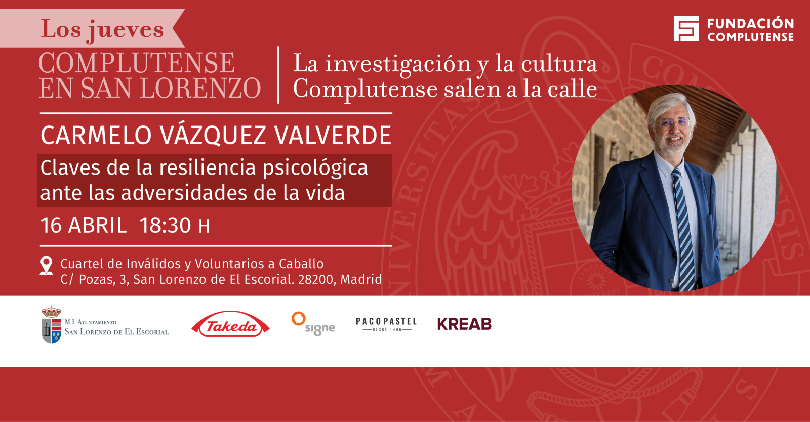 Con la colaboración del Ayuntamiento de San Lorenzo de El Escorial y el patrocinio de diferentes empresas, “Los Jueves Complutense” dará comienzo el próximo 16 de abril, con la conferencia “Claves de la resiliencia psicológica ante las adversidades de la vida”, que correrá a cargo del catedrático de la Facultad de Filología, Carmelo Vázquez. Por su parte, el 24 de abril será el profesor de la Facultad de Ciencias de la Documentación,