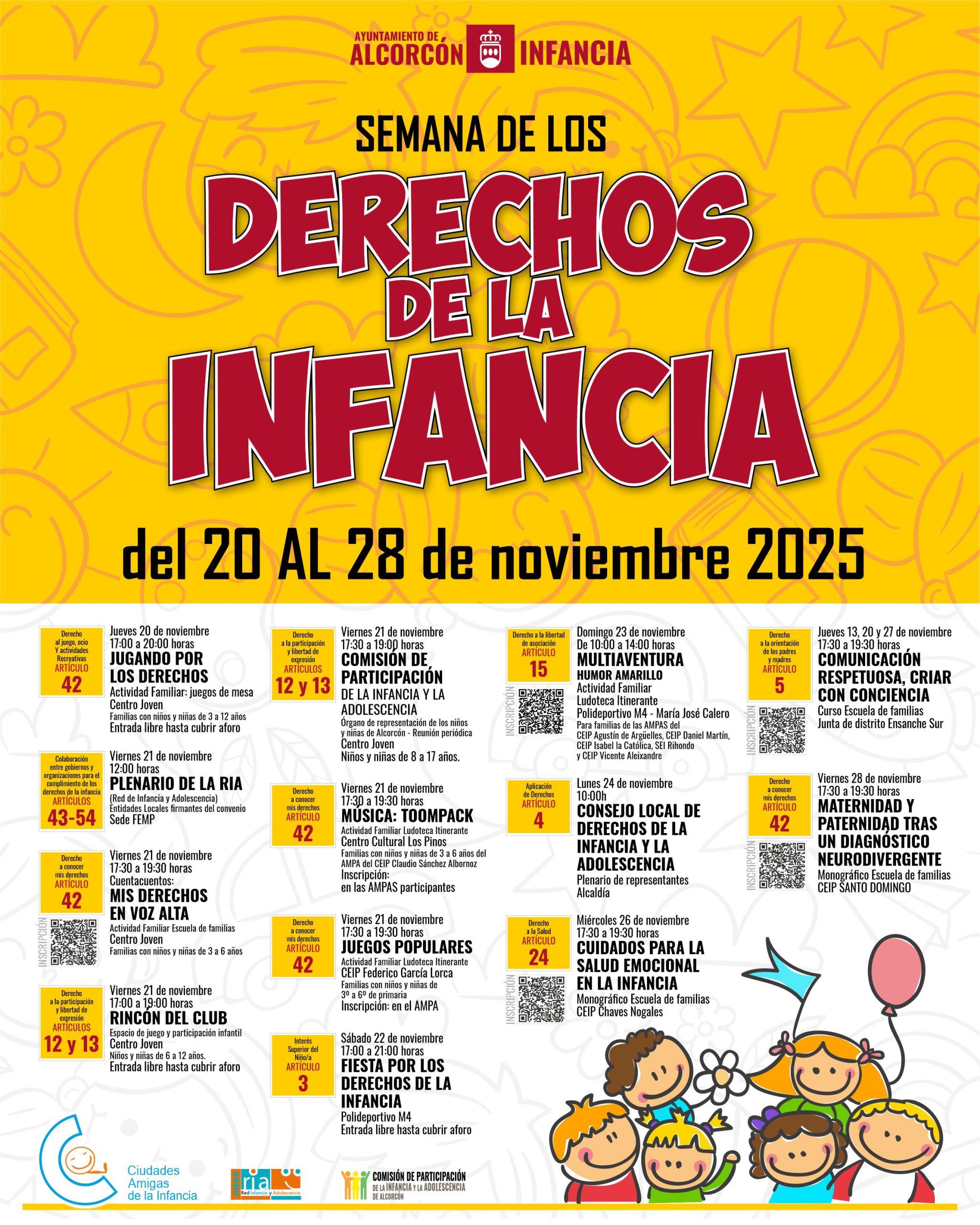 Además, el Centro Joven acogerá la Comisión de Participación de la Infancia y Adolescencia, el órgano de representación de los niños y niñas de Alcorcón el viernes 21 de noviembre de 17.30 a 19 horas, así como el plenario de los representantes del Consejo Local de Derechos de la Infancia y la Adolescencia el próximo 24 de noviembre a partir de las 10 horas en el Ayuntamiento de Alcorcón.