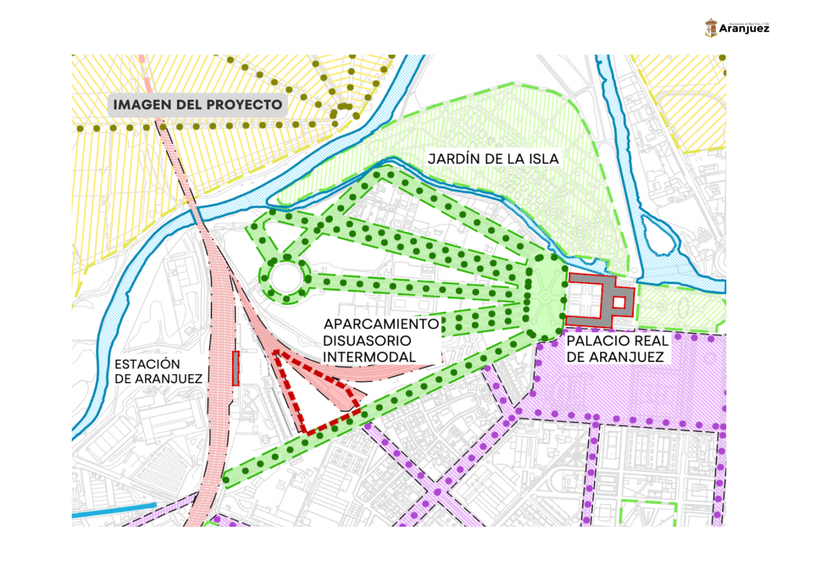 El proyecto, con un presupuesto de ejecución de 683.865,90 euros, ha sido redactado por Aquidos Arquitectes, Técnics i Gestió SLP y tiene como objeto la ordenación y mejora funcional del ámbito situado frente a la Estación de Ferrocarril, un espacio que hasta ahora venía siendo utilizado de forma informal e indiscriminada como zona de aparcamiento. La actuación se concibe como un aparcamiento disuasorio intermodal con más de 400 plazas de aparcamiento, directamente vinculado a la Estación de Ferrocarril de Aranjuez, situada en el extremo final de la línea C3 Madrid–Aranjuez. El proyecto fomenta una movilidad baja en carbono, gracias a su conexión con la actuación actualmente en desarrollo de la conexión peatonal entre el Palacio Real y la Estación, la incorporación de puntos de recarga para vehículos eléctricos y su estrecha relación con el transporte ferroviario, racionalizando el uso del espacio y favoreciendo una movilidad más sostenible.
