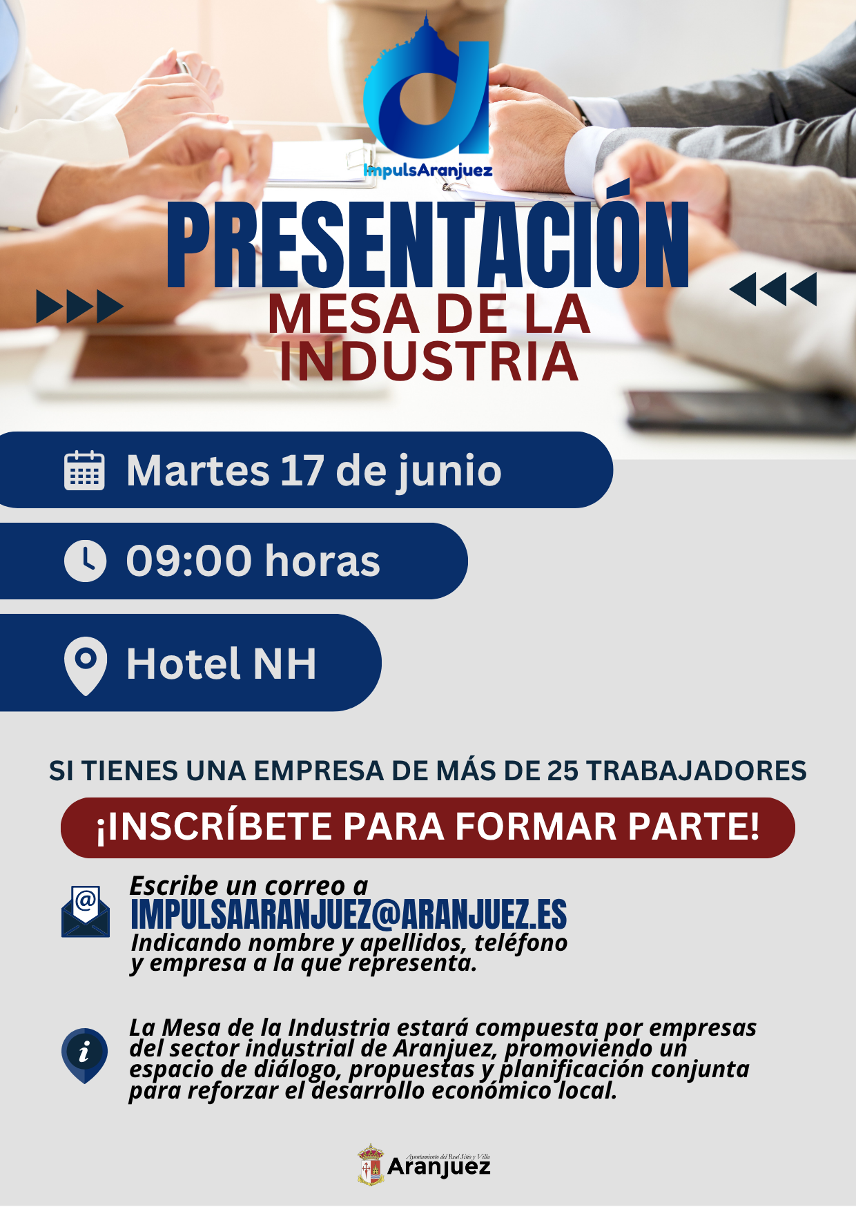 El Ayuntamiento de Aranjuez ha anunciado la creación de la Mesa de la Industria, una nueva iniciativa destinada a fortalecer el sector industrial y fomentar el crecimiento económico en el municipio. La presentación oficial tendrá lugar el próximo martes 17 de junio a las 09:00 horas en el Hotel NH de la ciudad.