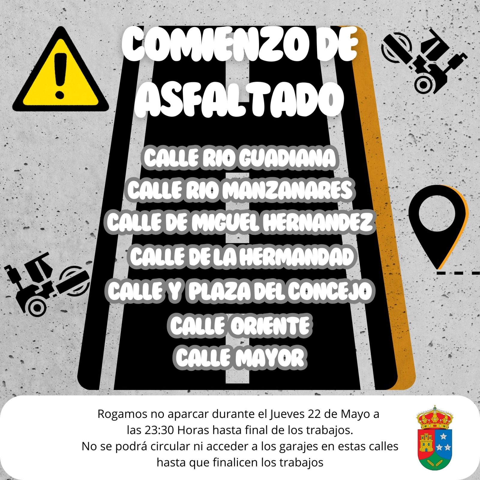 Se recuerda que fue necesario retirar los vehículos desde la noche del jueves 22 de mayo, a partir de las 23:30 horas, para facilitar el desarrollo de las obras. Durante el periodo de asfaltado, la circulación y el acceso a garajes en estas calles han estado restringidos.