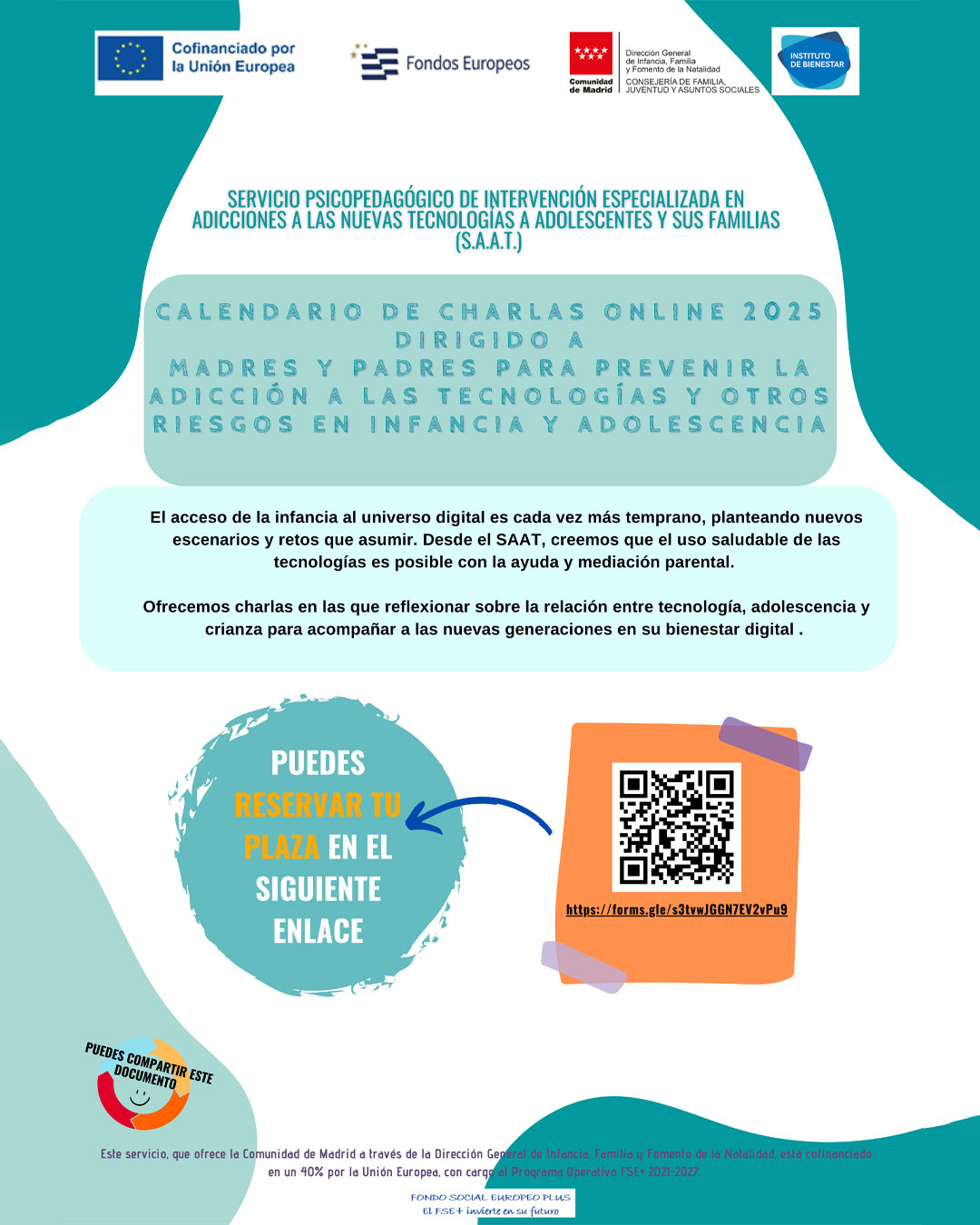 El Servicio Psicopedagógico de Intervención Especializada en Adicciones a las Nuevas Tecnologías (S.A.A.T.) ha lanzado una serie de charlas online dirigidas a padres, madres y adolescentes, con el objetivo de prevenir la adicción a las tecnologías y otros riesgos asociados al uso de dispositivos electrónicos.