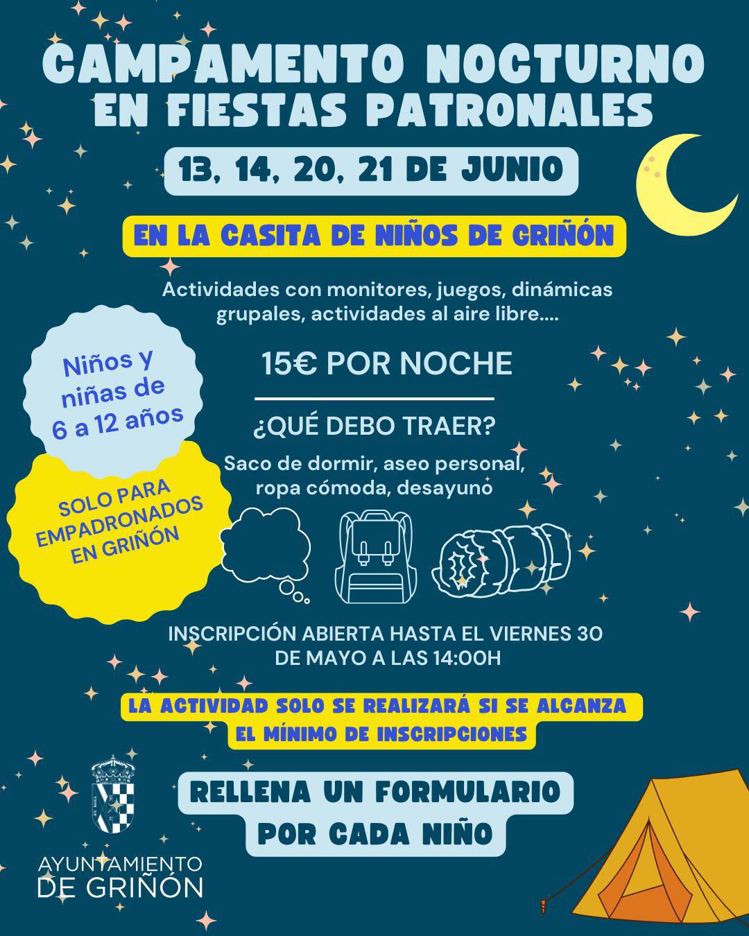 Con el objetivo de apoyar a las familias del municipio y fomentar un disfrute más tranquilo de las próximas fiestas patronales, el Ayuntamiento de Griñón ha puesto en marcha una novedosa iniciativa: un campamento nocturno para niños y niñas de entre 6 y 12 años.