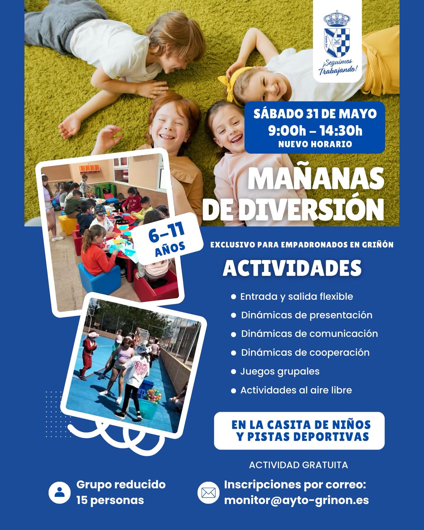 El Ayuntamiento de Griñón lanza una nueva iniciativa gratuita pensada especialmente para niños y niñas de entre 6 y 11 años: una jornada repleta de juegos, dinámicas y diversión al aire libre. La actividad, bajo el nombre Mañanas de Diversión en Griñón, tendrá lugar el sábado 31 de mayo en horario de 9:00 a 9:30 horas y de 14:00 a 14:30 horas, con entrada y salida flexible para facilitar la conciliación familiar.