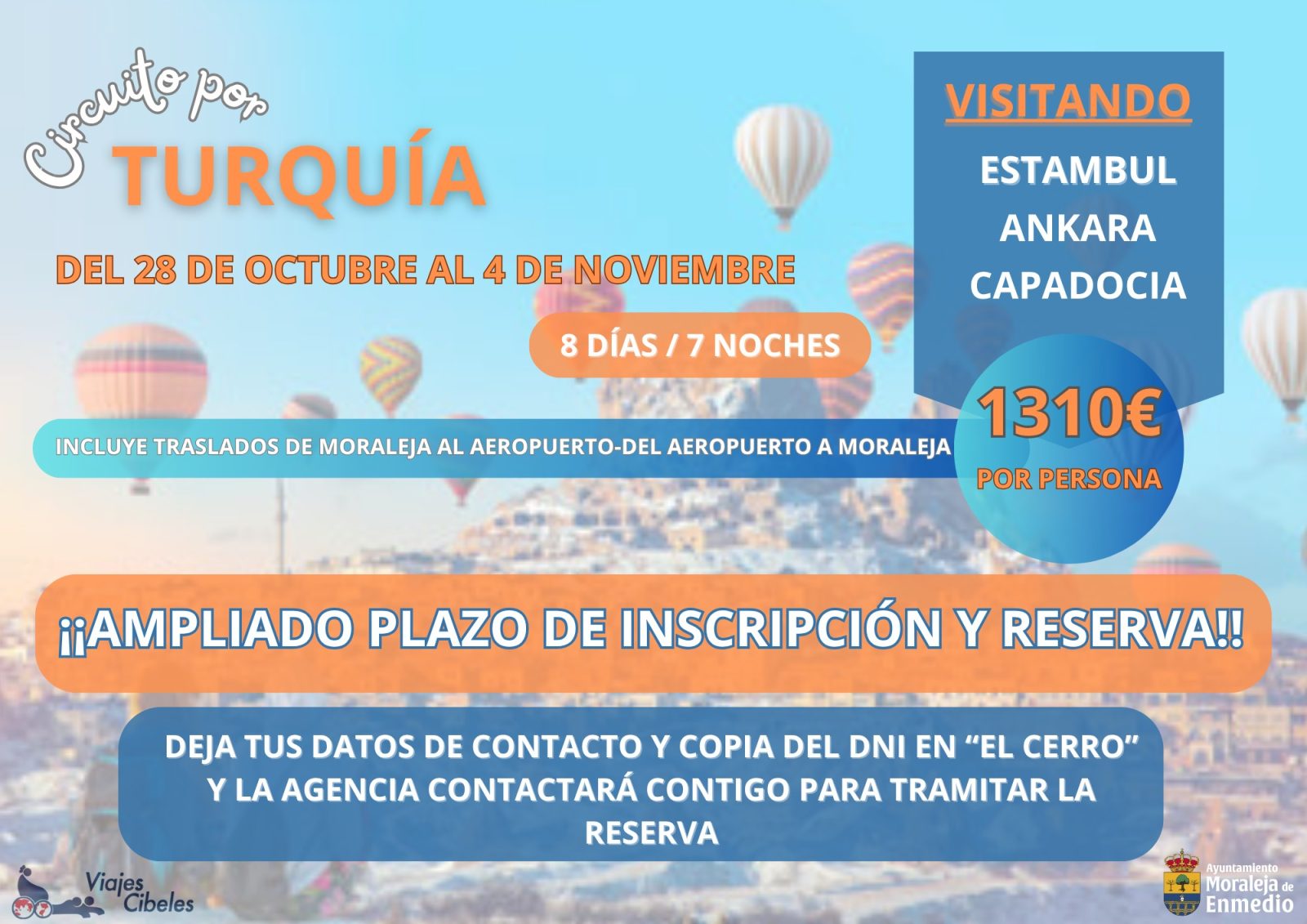 El Ayuntamiento ha anunciado la ampliación del plazo de inscripción y reserva para el esperado viaje a Turquía, organizado por Viajes Cibeles, que se celebrará del 28 de octubre al 4 de noviembre.