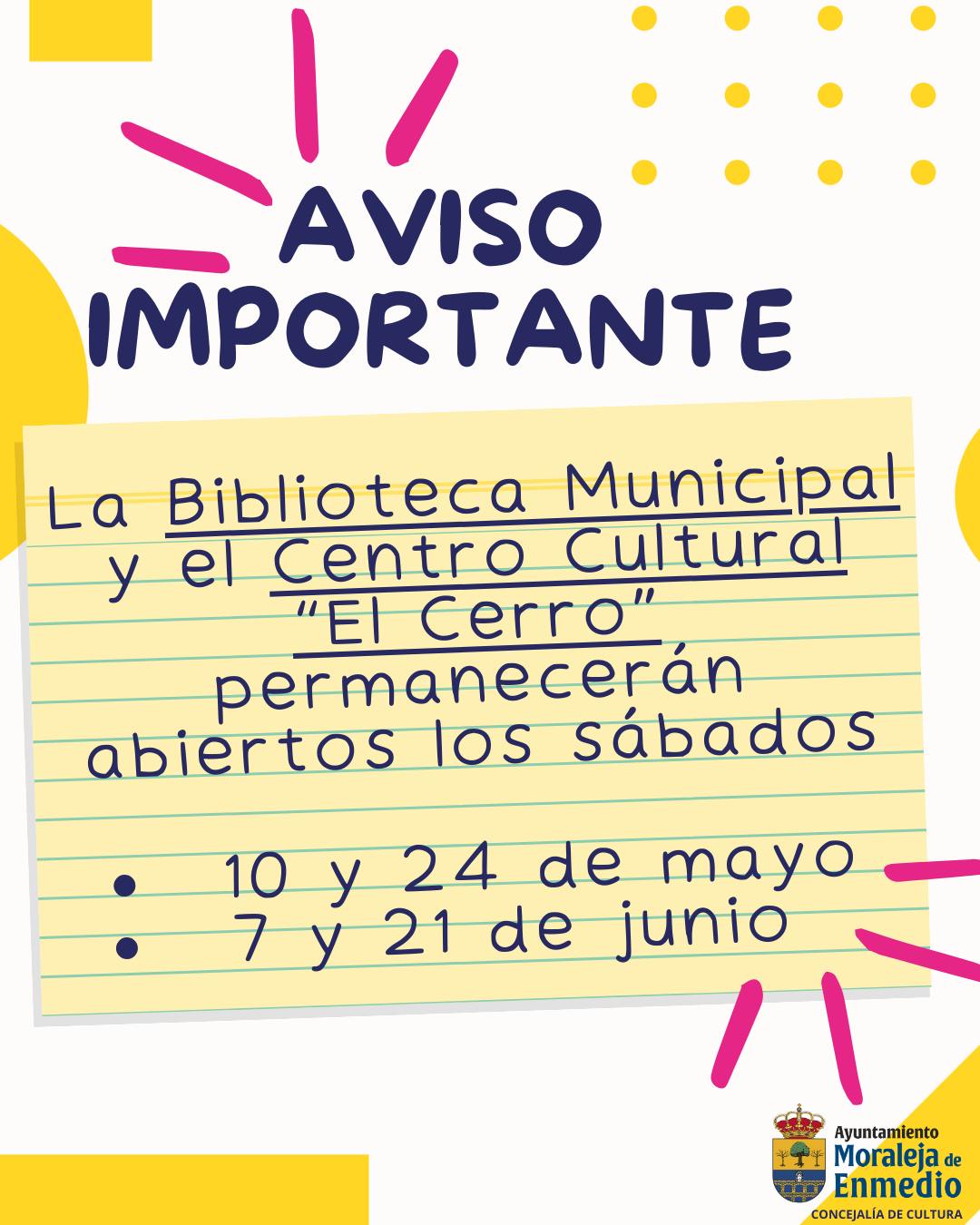 El Ayuntamiento de Moraleja de Enmedio ha anunciado que el Centro Cultural «El Cerro» ampliará su horario de apertura durante los meses de mayo y junio de 2025. Como novedad, las instalaciones estarán disponibles también los sábados, una medida que busca fomentar la participación ciudadana en las actividades culturales del municipio y facilitar el acceso a los servicios que ofrece el centro durante el fin de semana.
