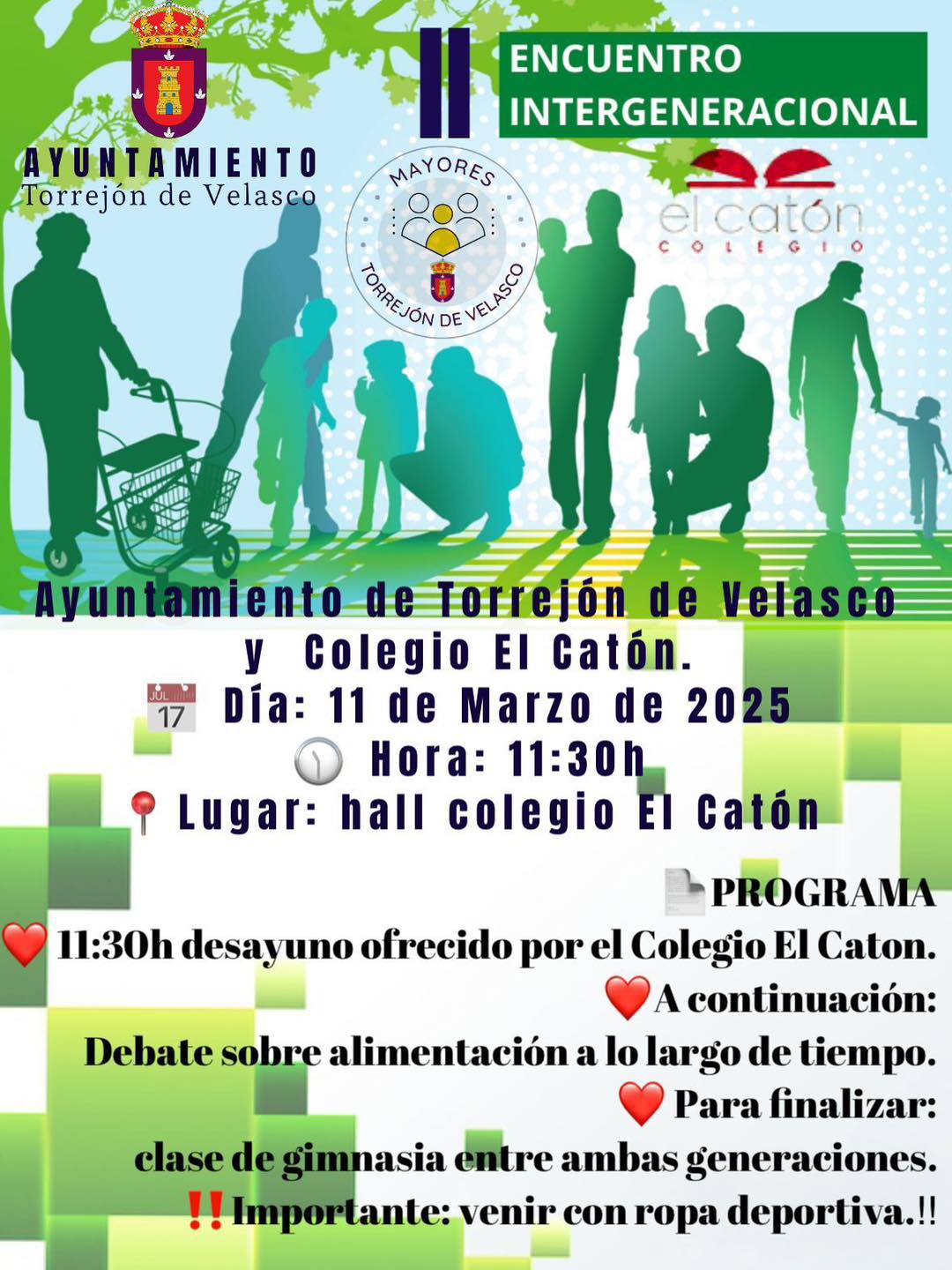 El próximo 11 de marzo de 2025, el Ayuntamiento de Torrejón de Velasco y el Colegio El Catón han organizado un Encuentro Intergeneracional que promete ser una experiencia única para todas las edades. La cita será en el Hall del Colegio El Catón a las 11:30h, donde los asistentes podrán disfrutar de una mañana llena de actividades que fomentan el aprendizaje y la convivencia entre generaciones.
