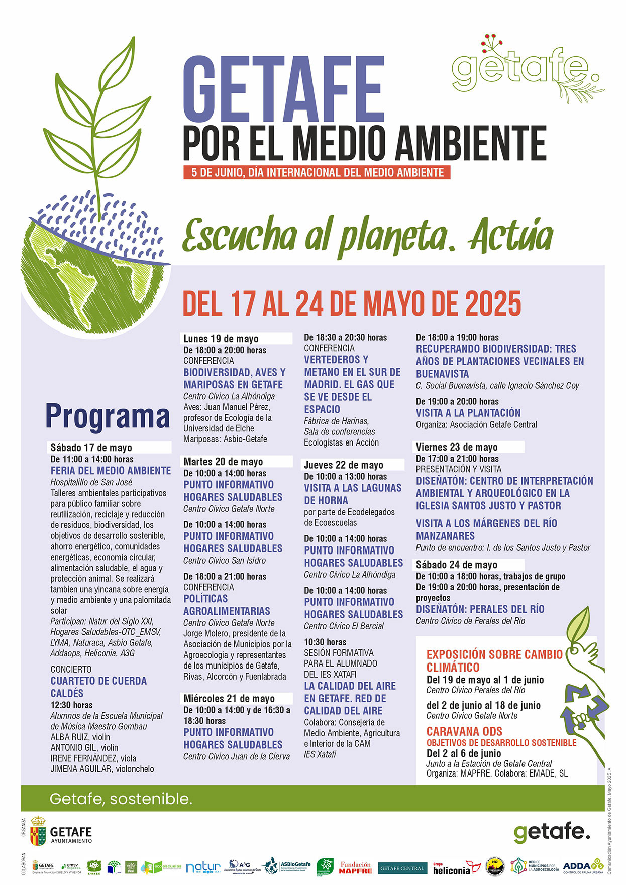 Con el objetivo de acercar los proyectos municipales y el trabajo de diversas entidades en materia ambiental, el Ayuntamiento de Getafe celebra la nueva edición de ‘Getafe por el Medio Ambiente’ bajo el lema “Escucha el planeta. Actúa”. La programación de actividades, que se desarrollará entre el 17 y el 24 de mayo, incluye una amplia variedad de eventos diseñados para sensibilizar a la ciudadanía y promover la acción en defensa del medio ambiente.