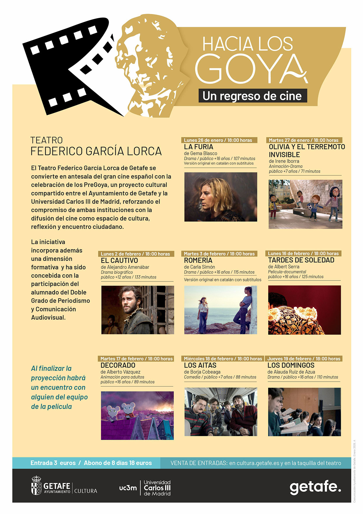 El precio de la entrada será de 3 euros por sesión, con la posibilidad de adquirir un abono para todo el ciclo por 18 euros. Tras cada proyección, el público podrá participar en un encuentro con miembros del equipo de la película, completando así una propuesta cultural que sitúa a Getafe en el camino hacia la gran noche del cine español.