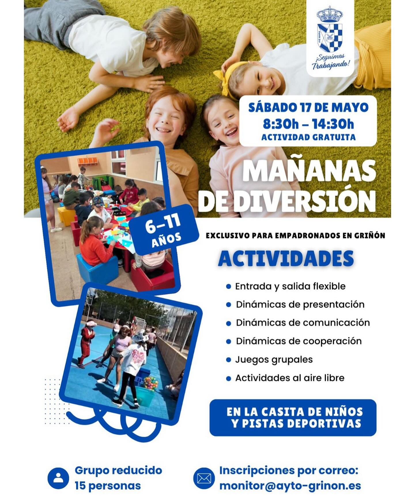 Griñón organiza una mañana llena de actividades pensadas especialmente para los niños y niñas de entre 6 y 11 años. El próximo sábado 17 de mayo, de 8:30 a 14:30 horas, los pequeños podrán disfrutar de dinámicas en grupo, juegos al aire libre y actividades que fomentan la cooperación y la comunicación, en un ambiente seguro y acogedor.