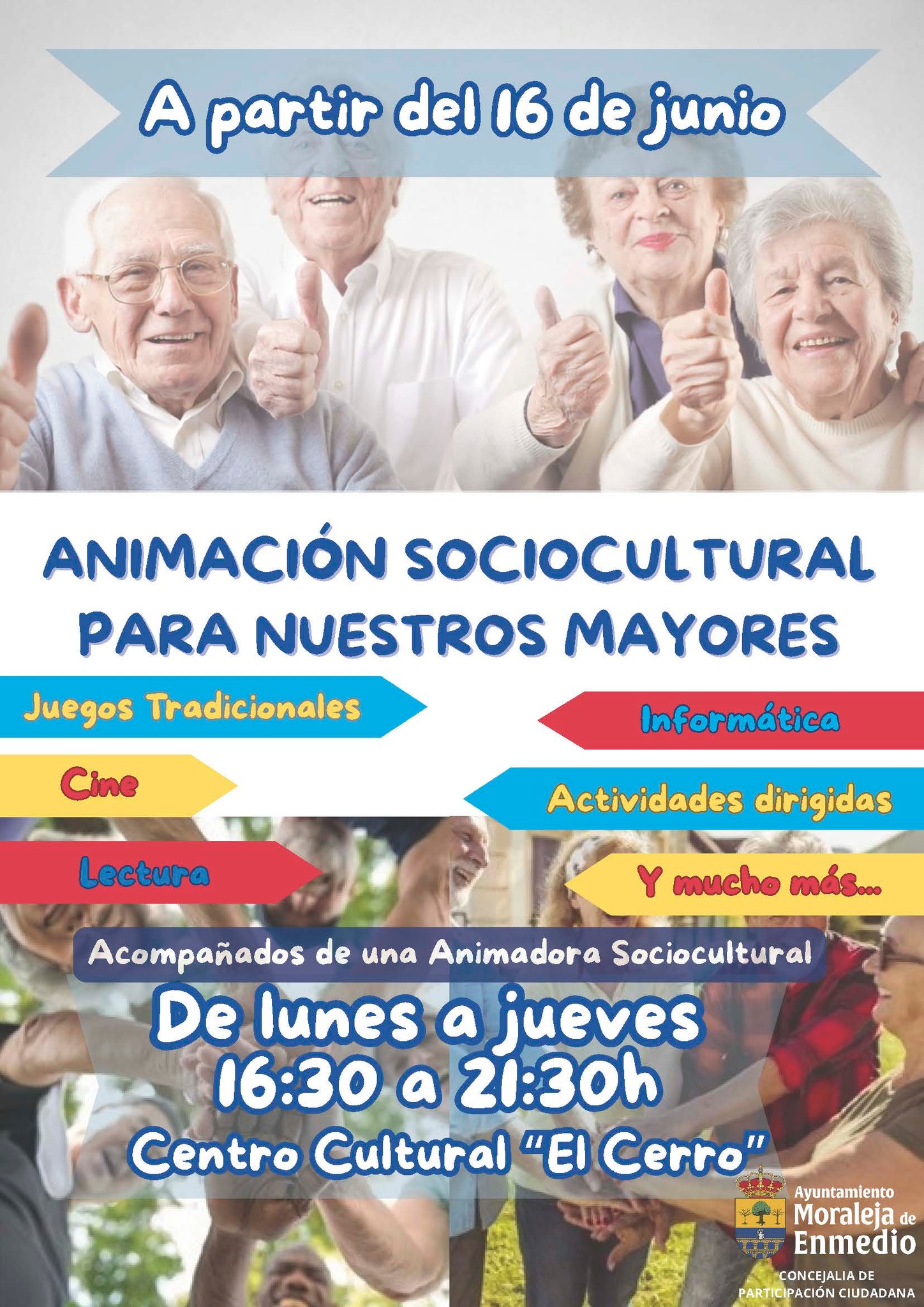 El Ayuntamiento de Moraleja de Enmedio pondrá en marcha a partir del lunes 16 de junio un nuevo servicio de animación sociocultural dirigido a sus vecinos mayores. Esta iniciativa, que no tendrá coste ni para el Ayuntamiento ni para los participantes, ha sido posible gracias a una subvención concedida por la Comunidad de Madrid.