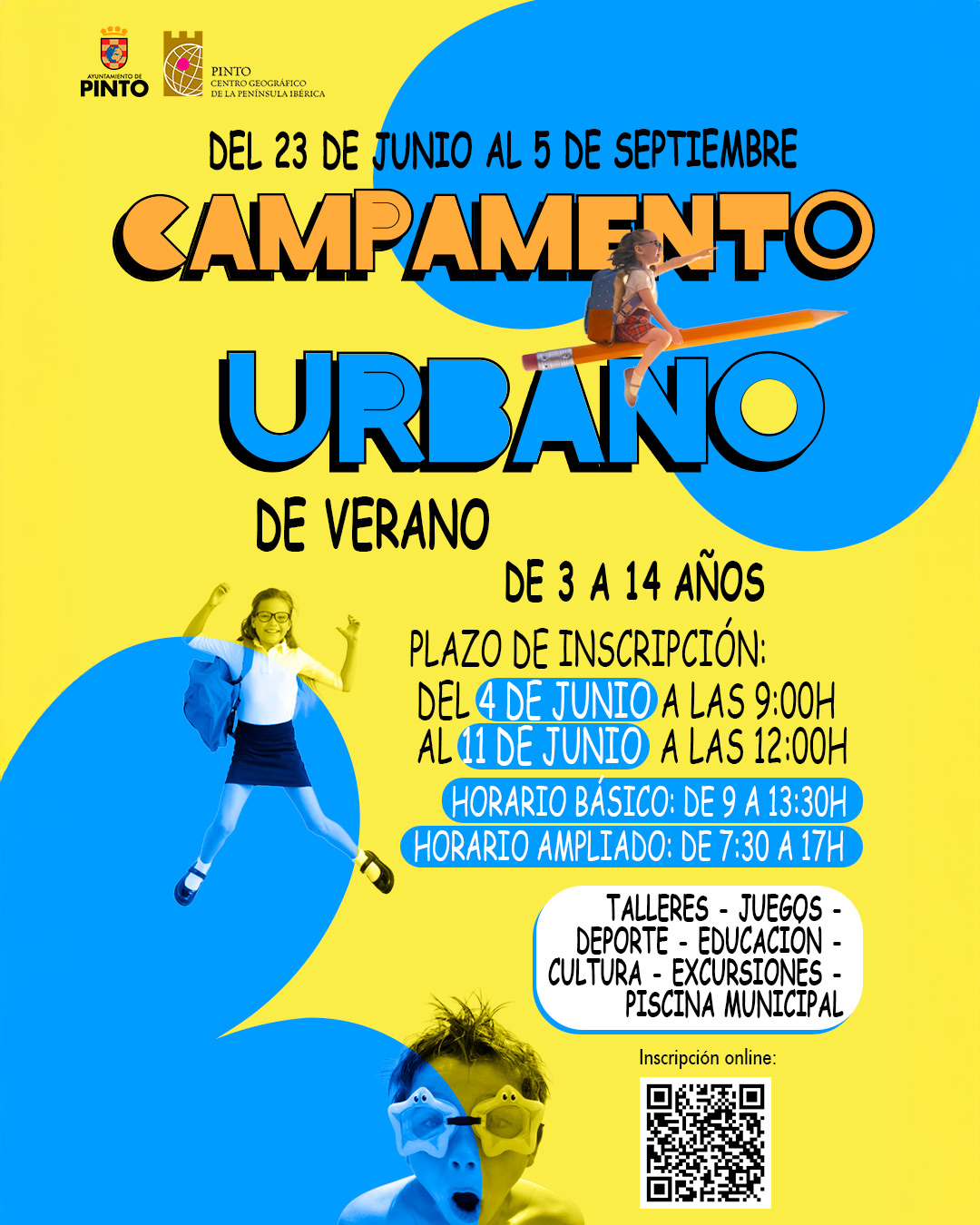 El próximo miércoles 4 de junio a las 9:00 horas, el Ayuntamiento de Pinto abrirá el plazo de inscripción para el Campamento Urbano de Verano 2025, dirigido a menores de entre 3 y 14 años escolarizados durante el curso 2024/2025. El campamento se celebrará del 23 de junio al 5 de septiembre en cuatro colegios del municipio —Europa, El Prado, Dos de Mayo y Buenos Aires—, así como en el Pabellón Príncipes de Asturias, donde se desarrollarán las actividades deportivas.