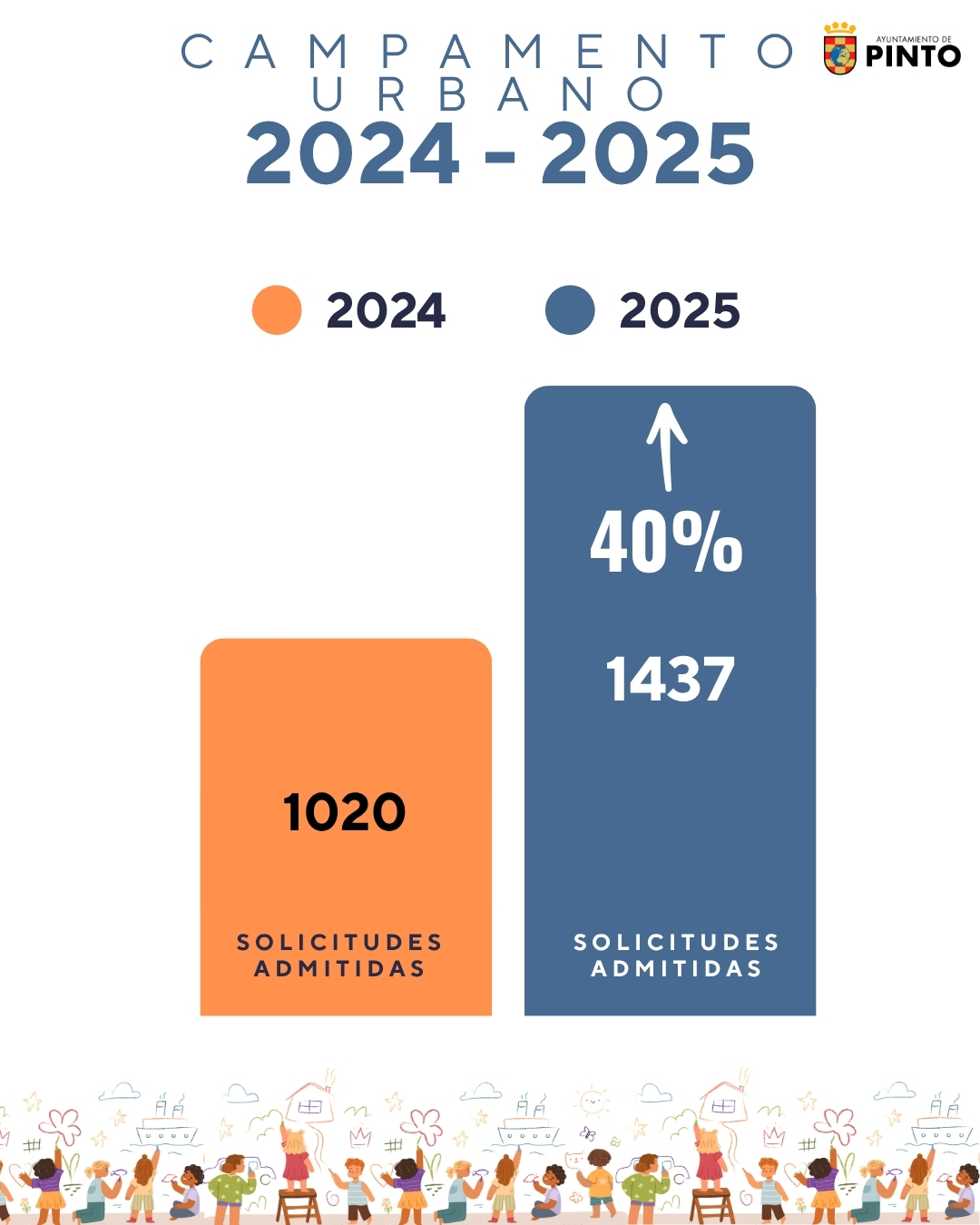 El Ayuntamiento de Pinto ha logrado cubrir el 94,2% de las solicitudes presentadas para el Campamento Urbano de Verano 2025, una cifra que marca un récord de participación y que refuerza el compromiso municipal con la conciliación familiar y laboral. En total, se han admitido 1.437 de las 1.525 solicitudes tramitadas por la empresa adjudicataria, quedando únicamente 88 en lista de espera.