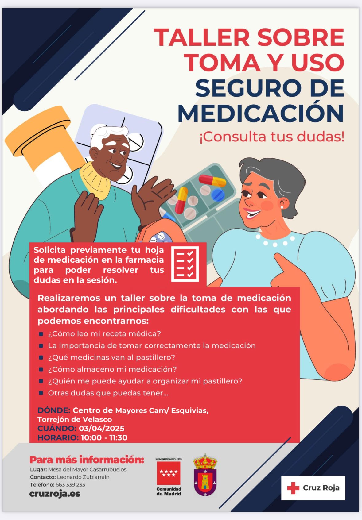 El Centro de Mayores Cam, ubicado en Esquivias, Torrejón de Velasco, acogerá el próximo 3 de abril un taller gratuito titulado “Toma y Uso Seguro de Medicación”. Este evento está dirigido a todas aquellas personas que deseen aprender cómo manejar sus medicamentos de manera correcta y segura.